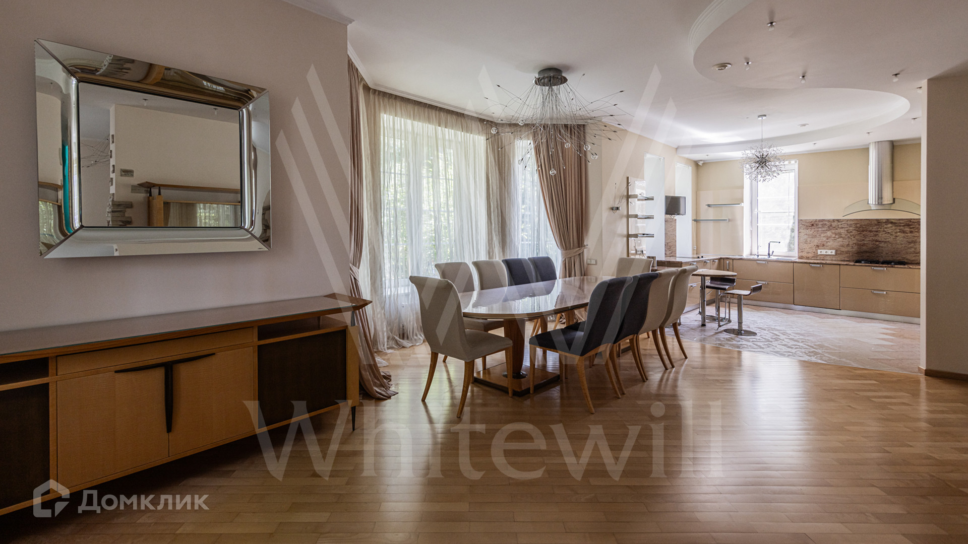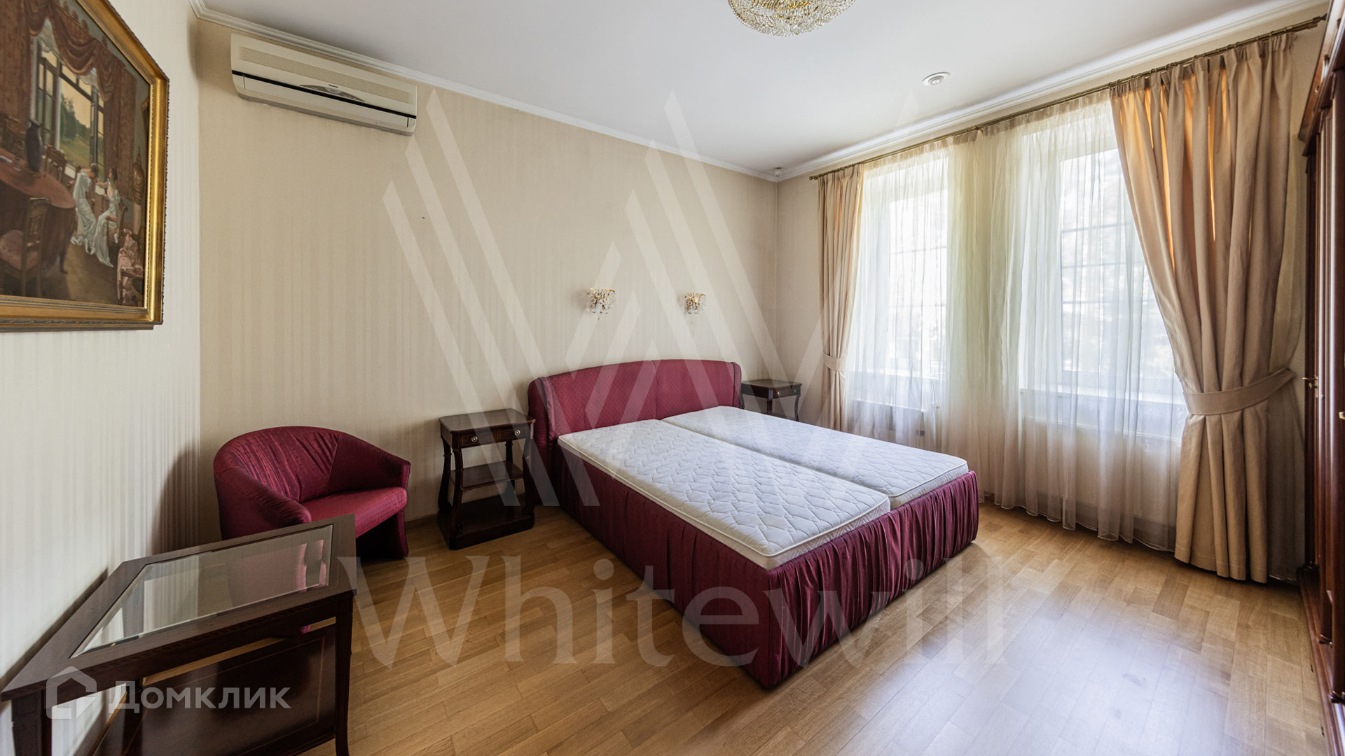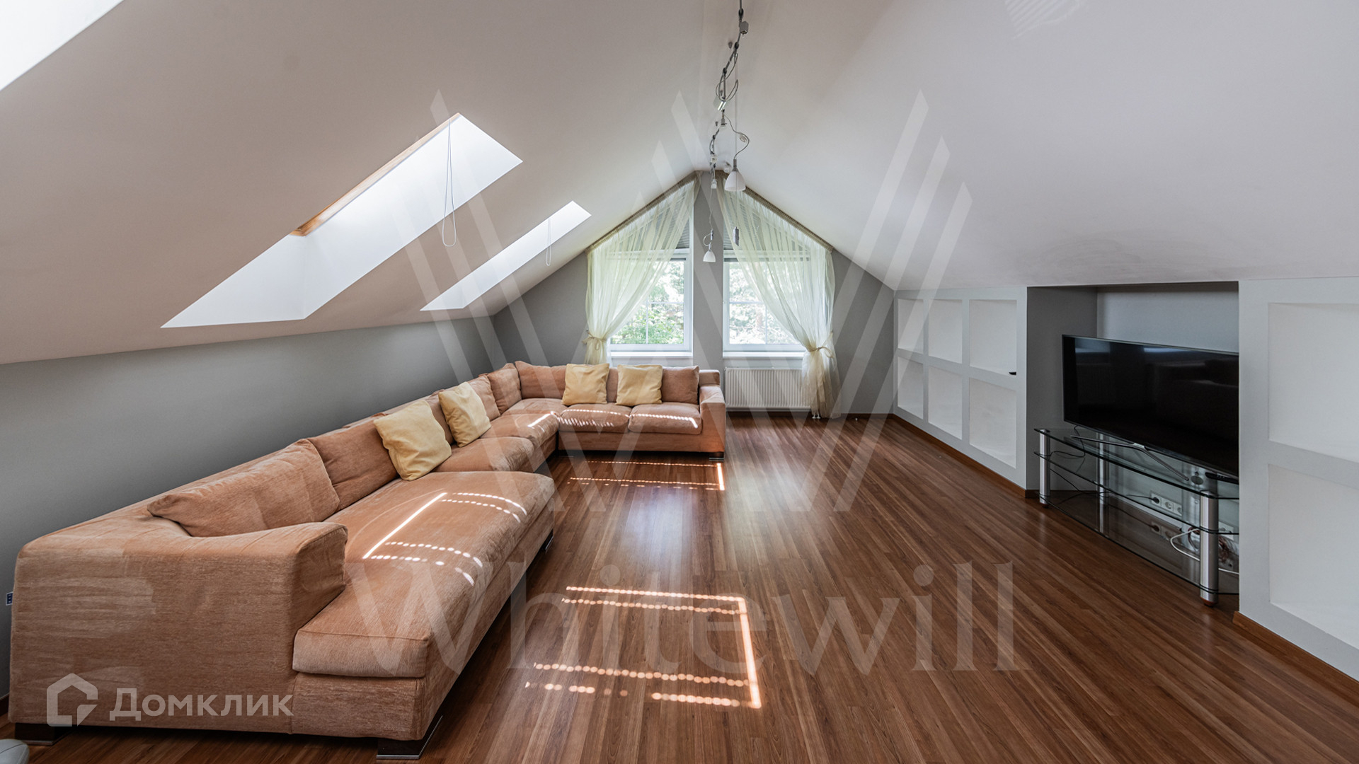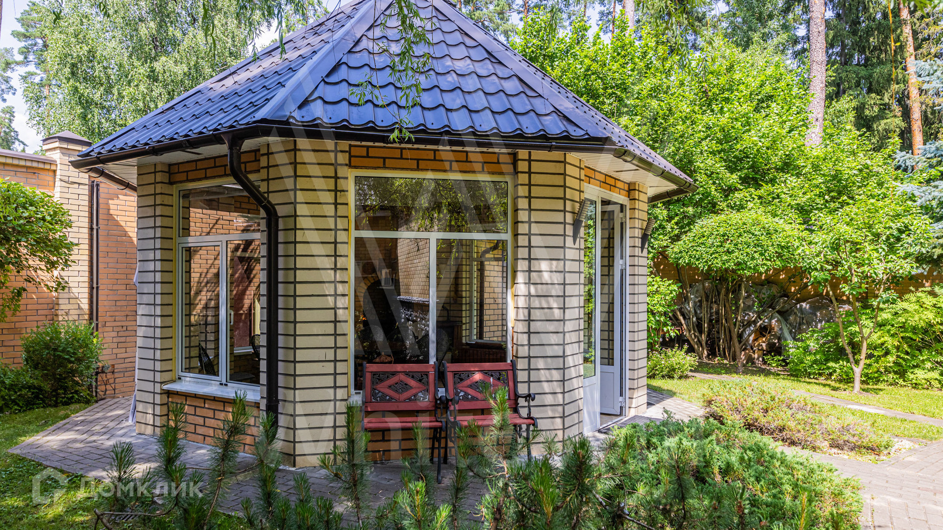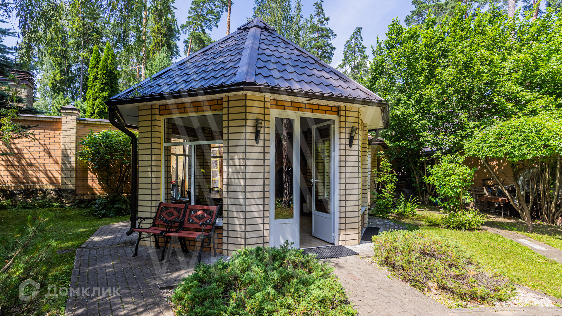ID 12 349. Коттон Вэй (Никологорское). Загородный дом площадью 450 м² расположен на просторном участке 30 соток с многолетними соснами. Фасад здания облицован бежевым клинкерным кирпичом и декорирован молочными вставками. В отделке светлого интерьера преобладают теплые оттенки, создающие атмосферу уюта. Планировка резиденции включает 5 спален, гостиную с камином, кухню, игровую, кабинет, спортзал с балетной стойкой, кинозал, сауну, джакузи и комнату отдыха. Предусмотрен гараж на 2 машины. На участке выполнен ландшафтный дизайн, засеян газон, вымощены дорожки и обустроены беседка с зоной барбекю и детская площадка.