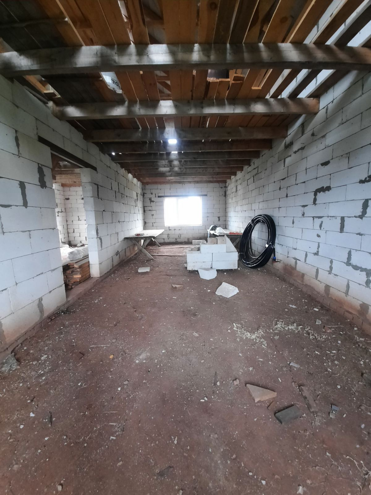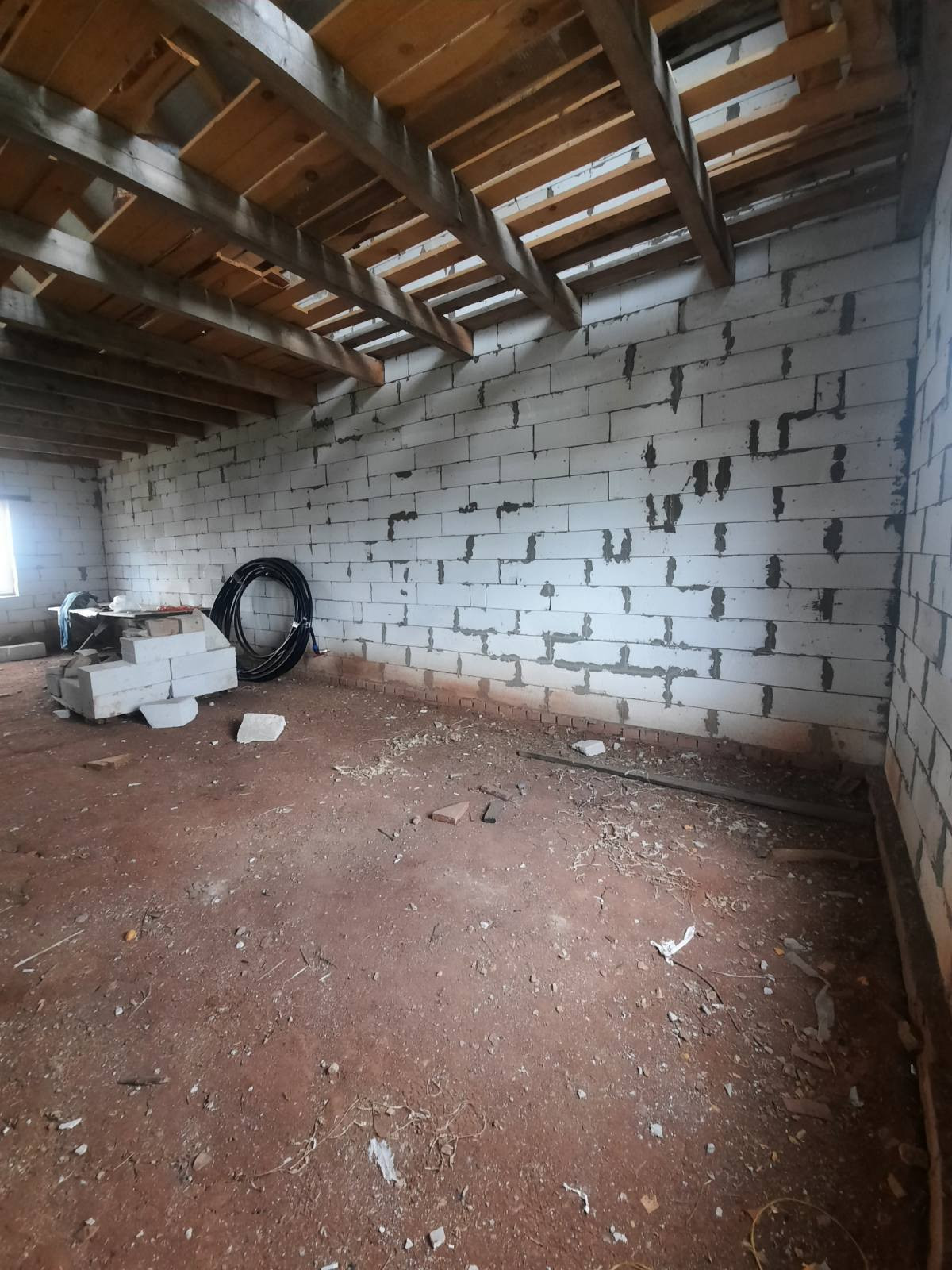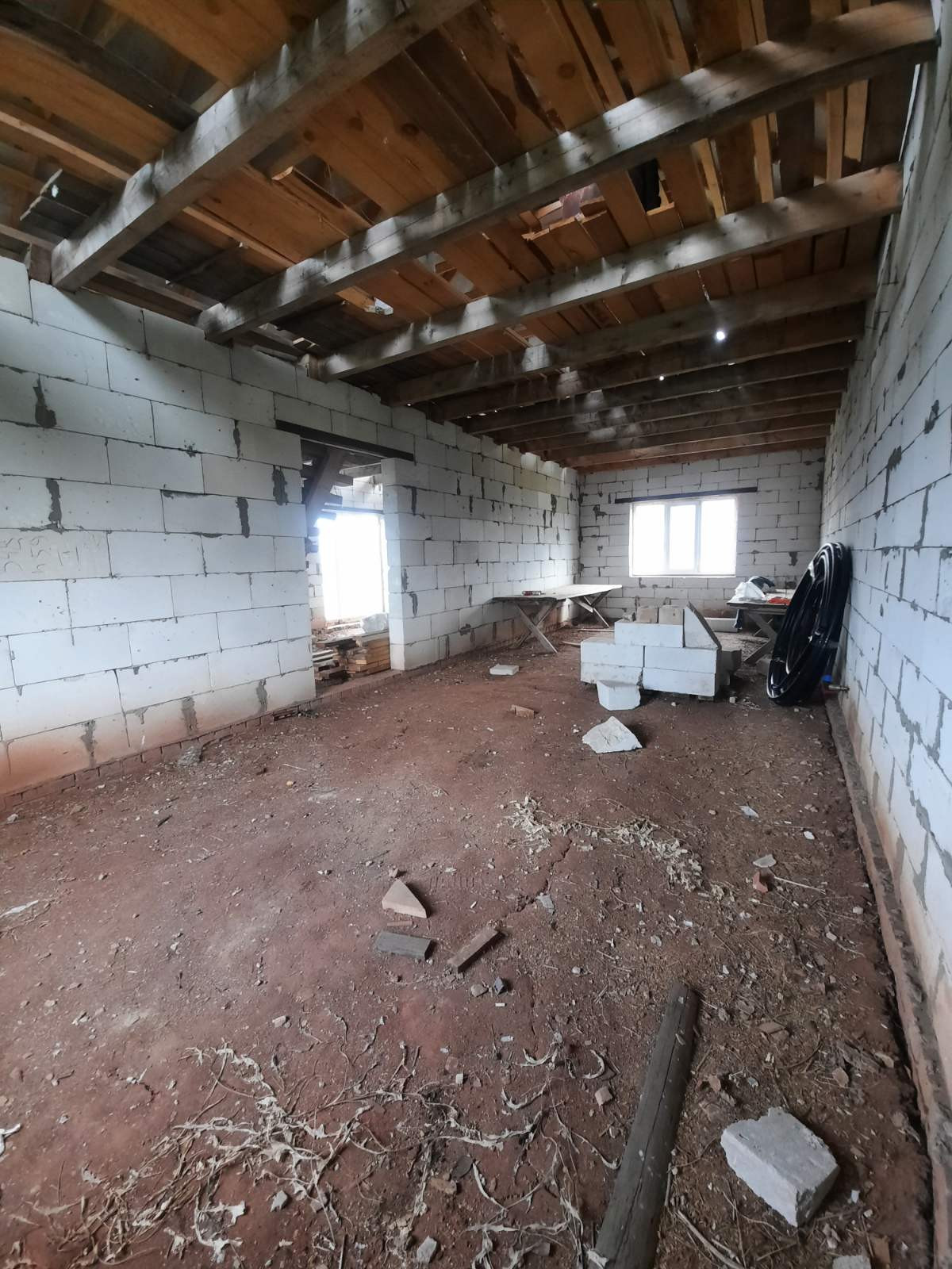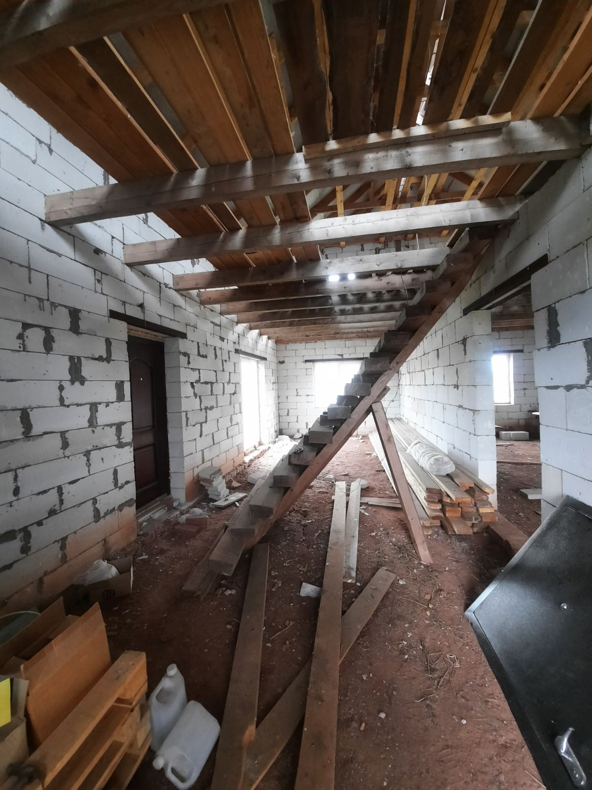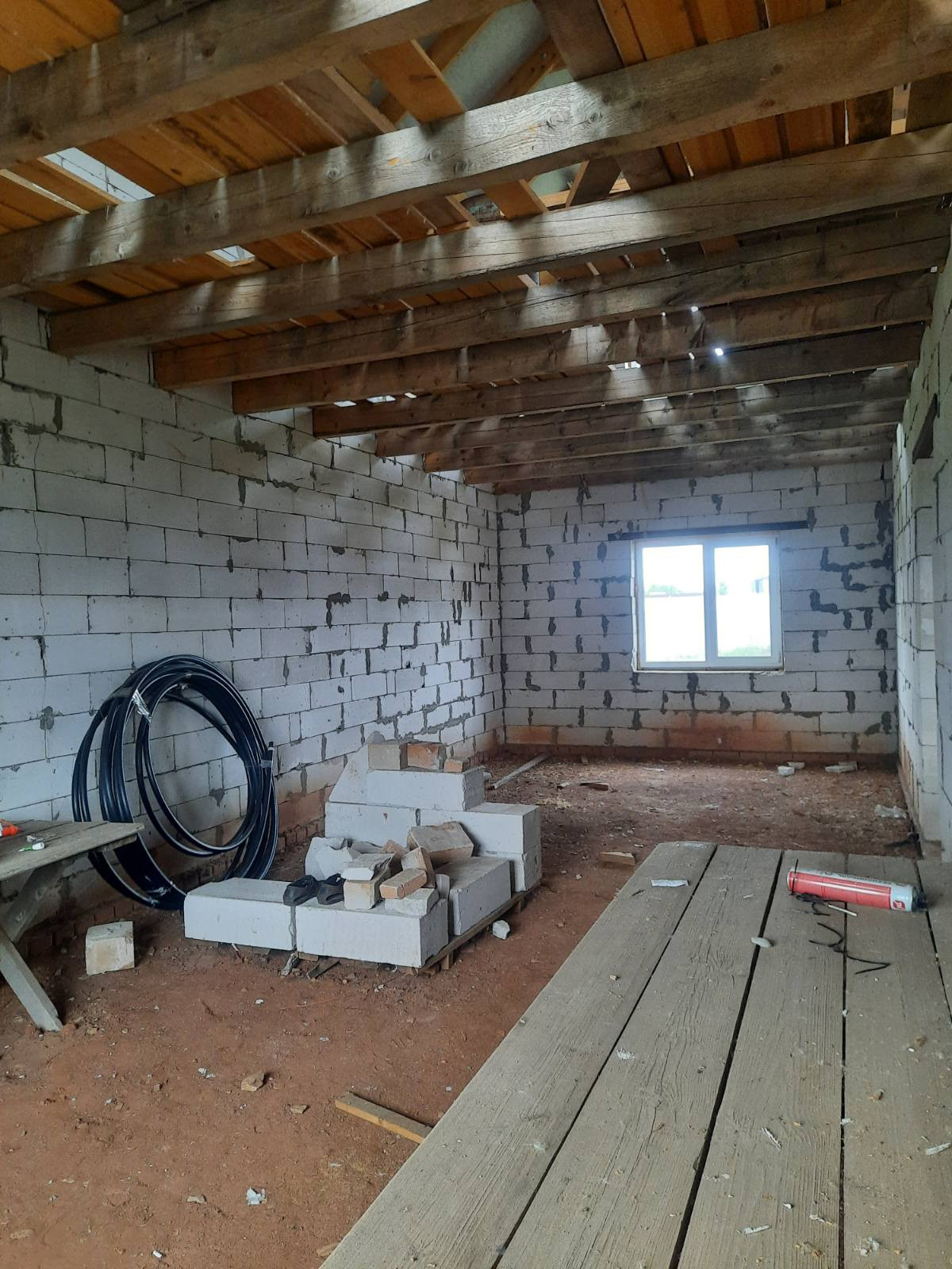Полностью возведен и закрыт. Стены из газоблоков. Перекрытия деревянные балки. Окна пластик. Двери установлены.