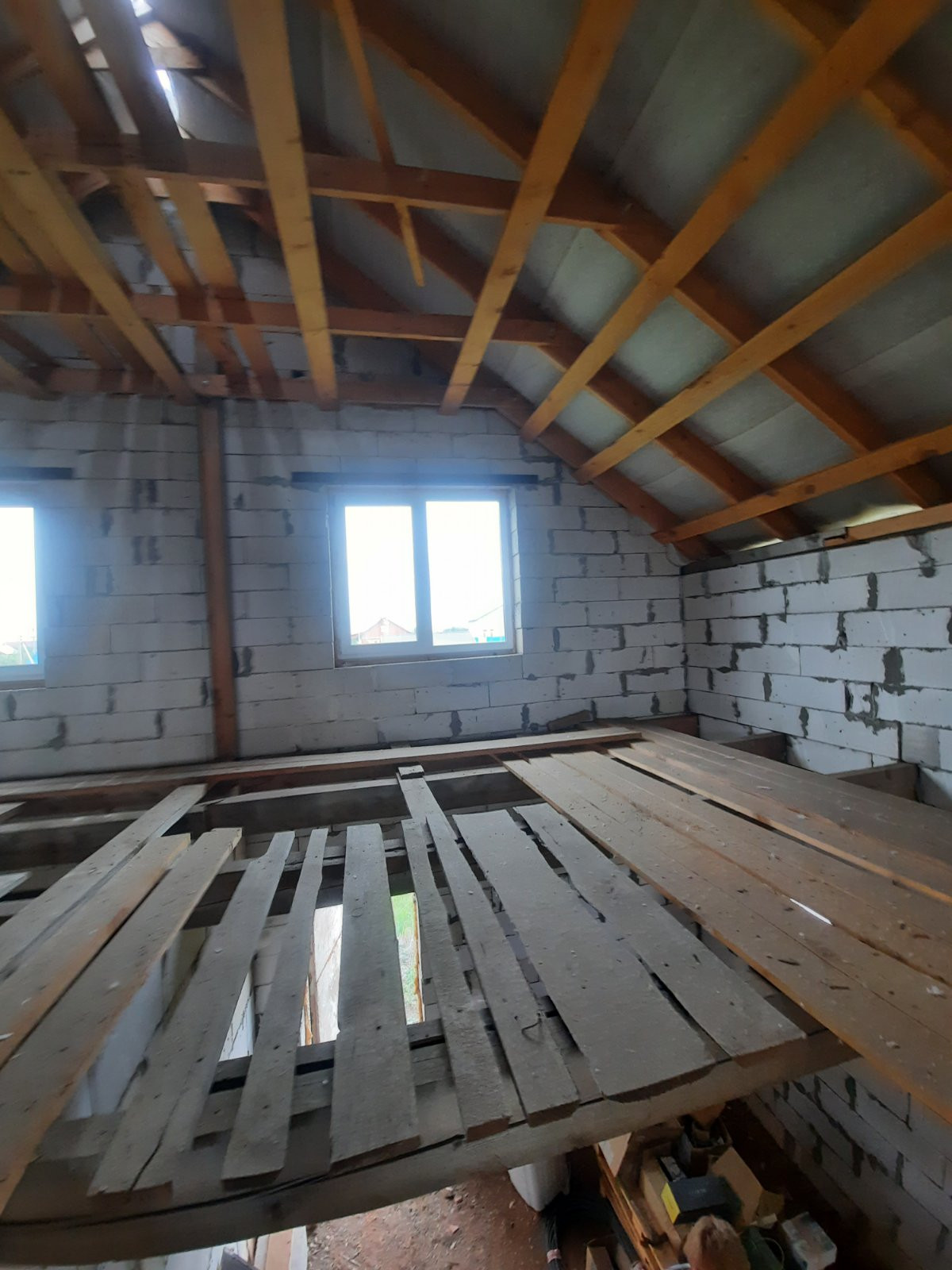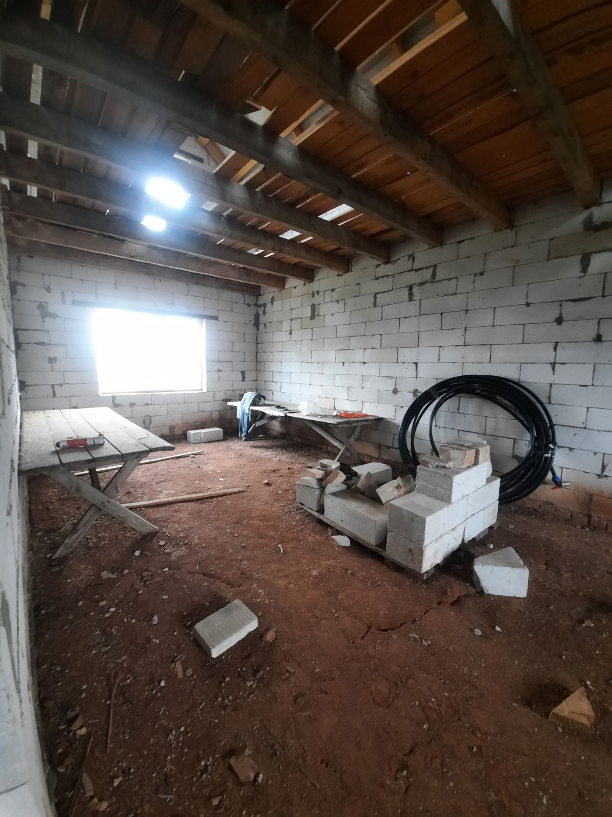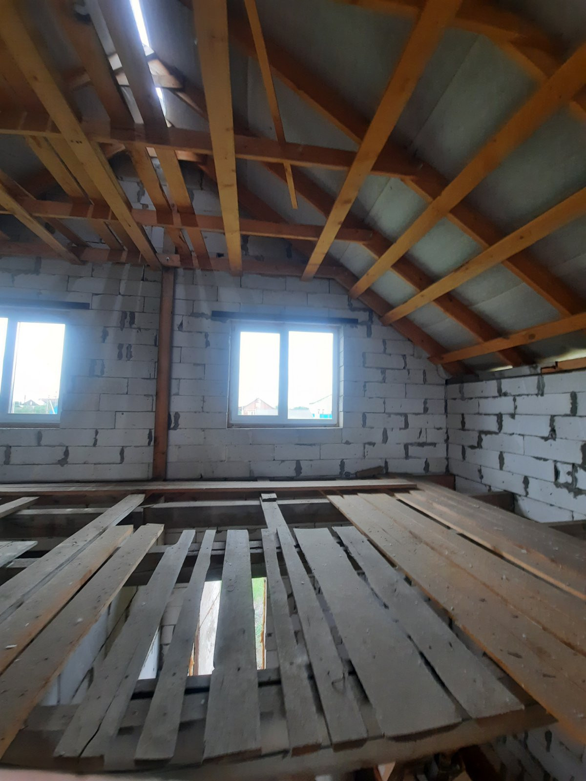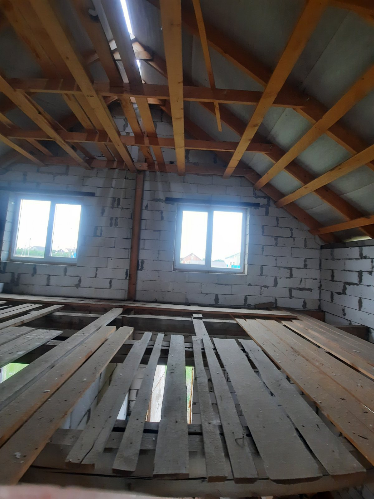 Полностью возведен и закрыт. Стены из газоблоков. Перекрытия деревянные балки. Окна пластик. Двери установлены.