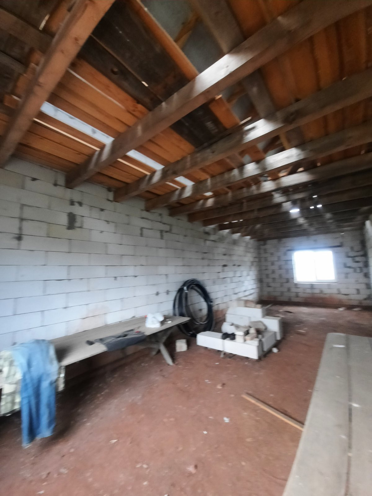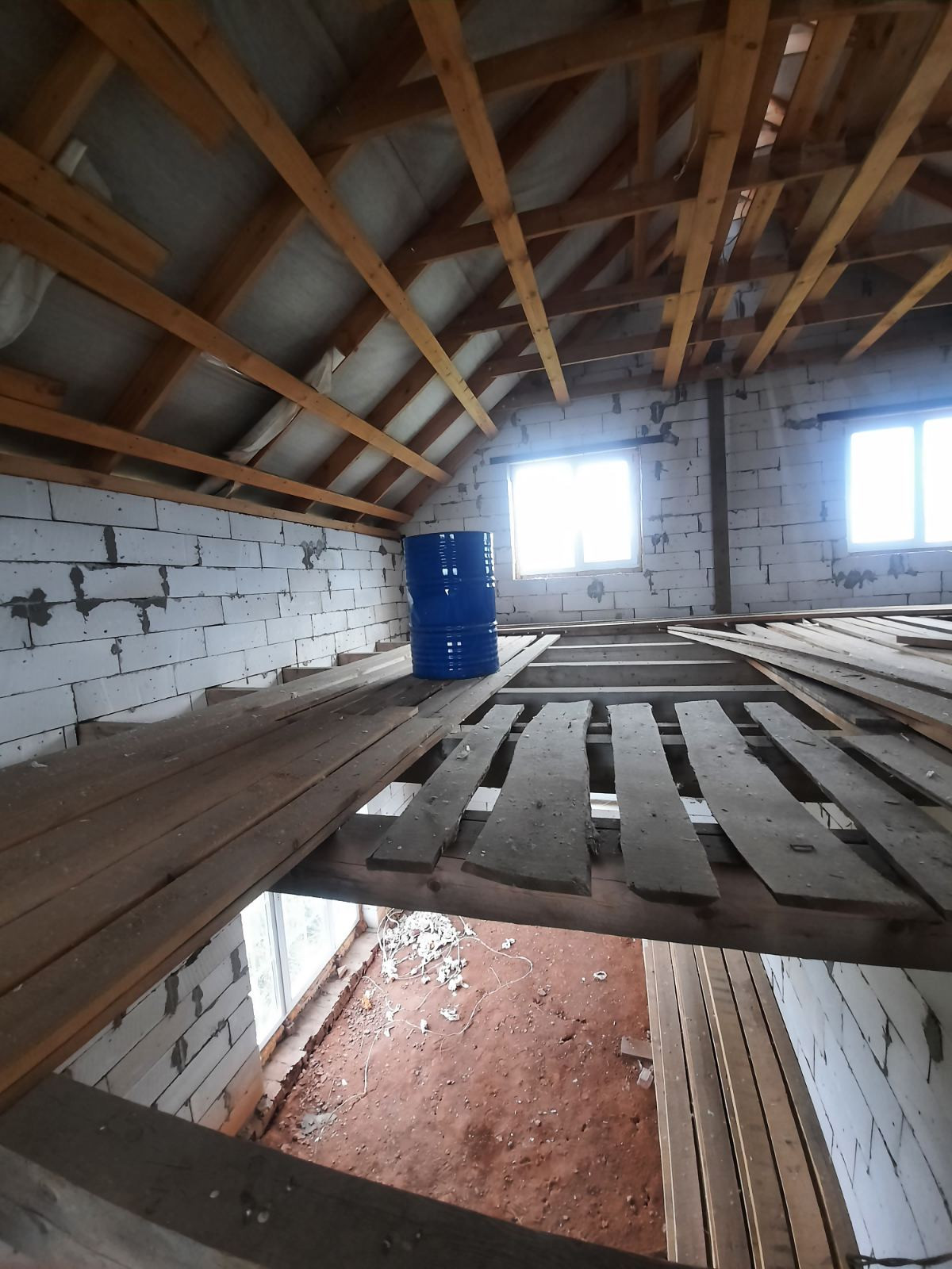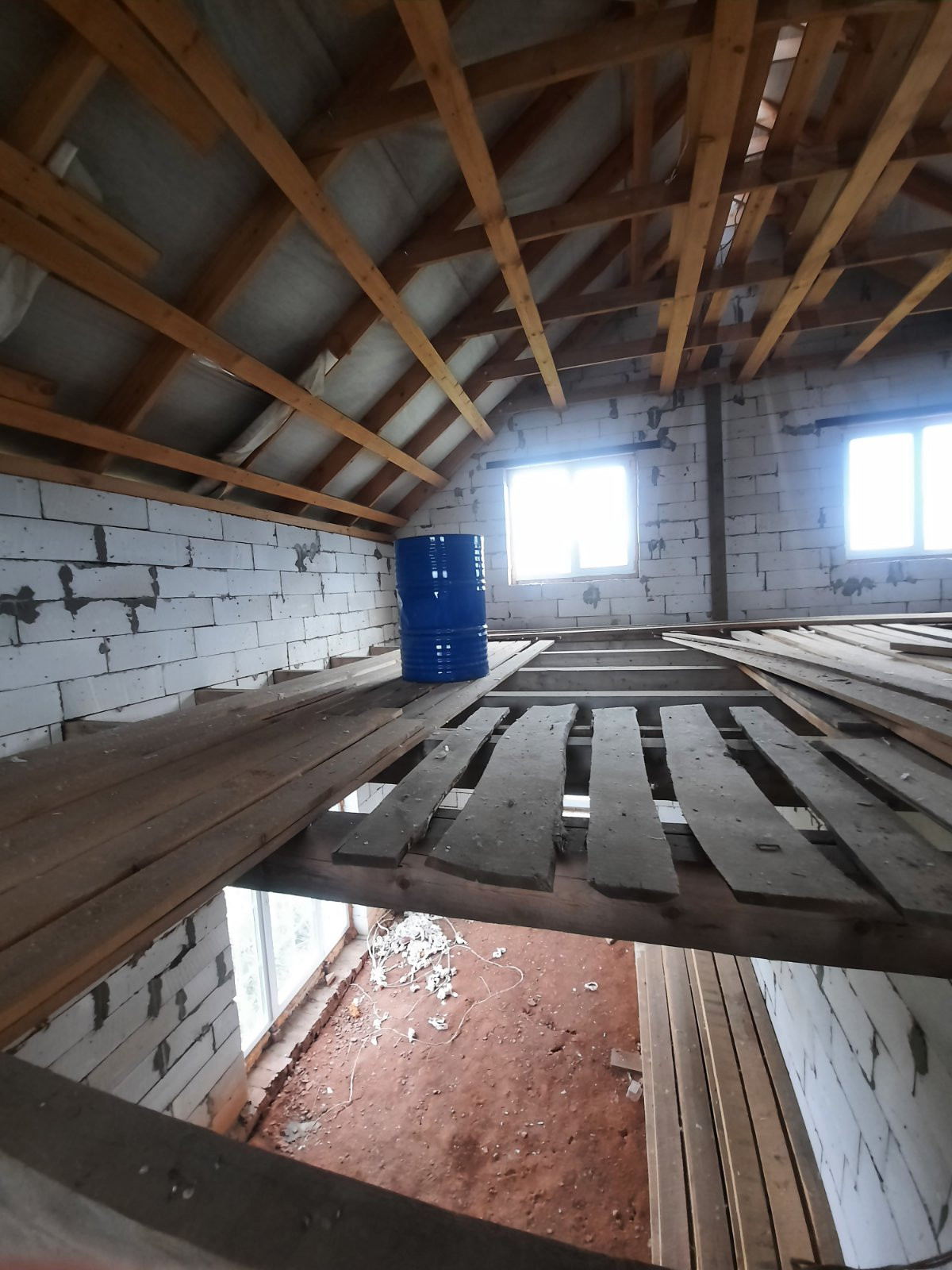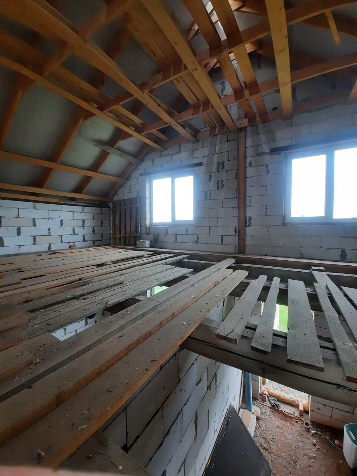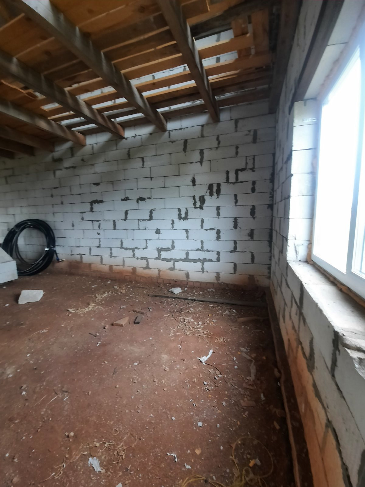 Полностью возведен и закрыт. Стены из газоблоков. Перекрытия деревянные балки. Окна пластик. Двери установлены.