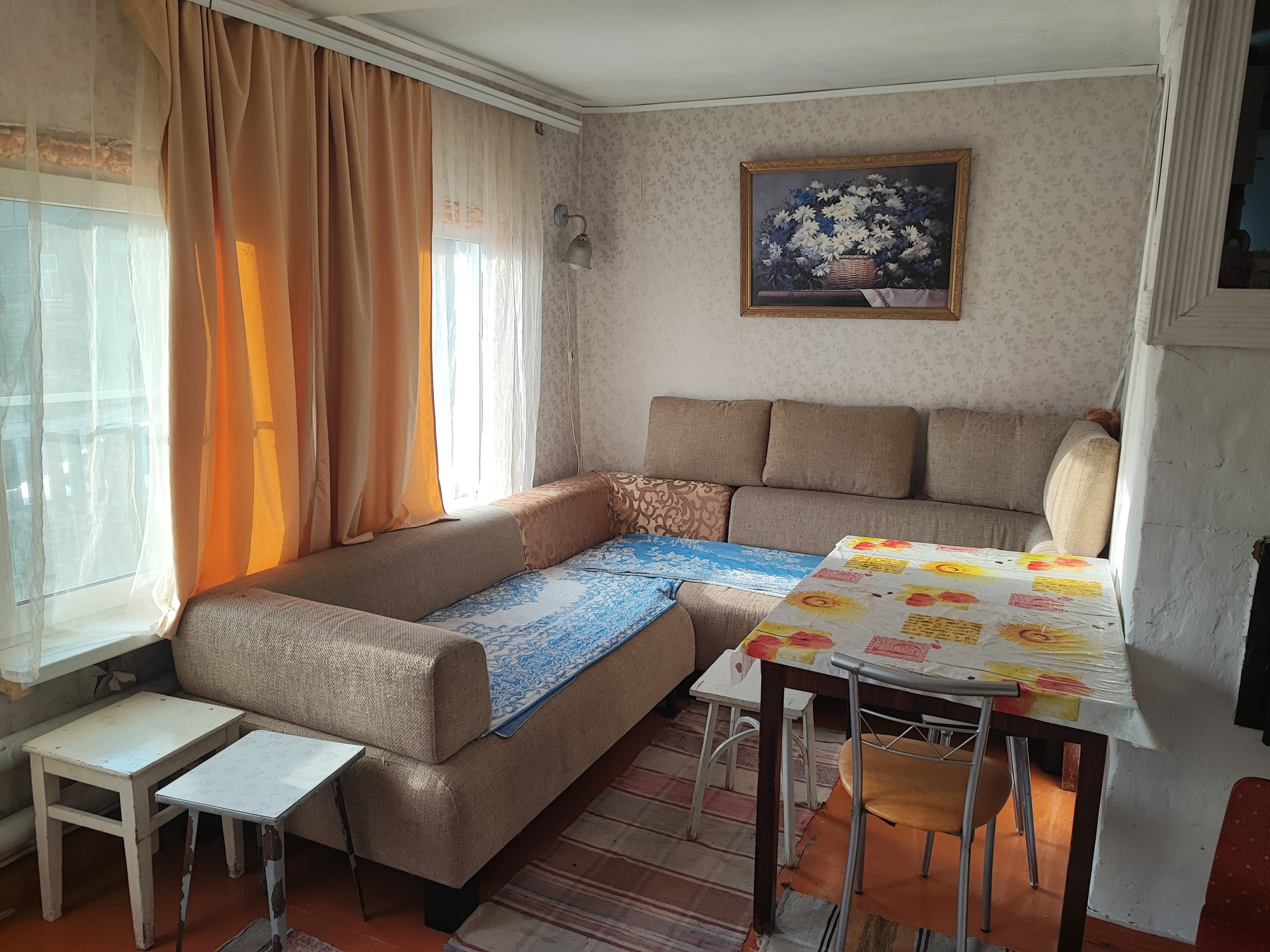 Пол в доме настелен ДВП, окрашен. Плинтуса утеплены- зимой не дует.
