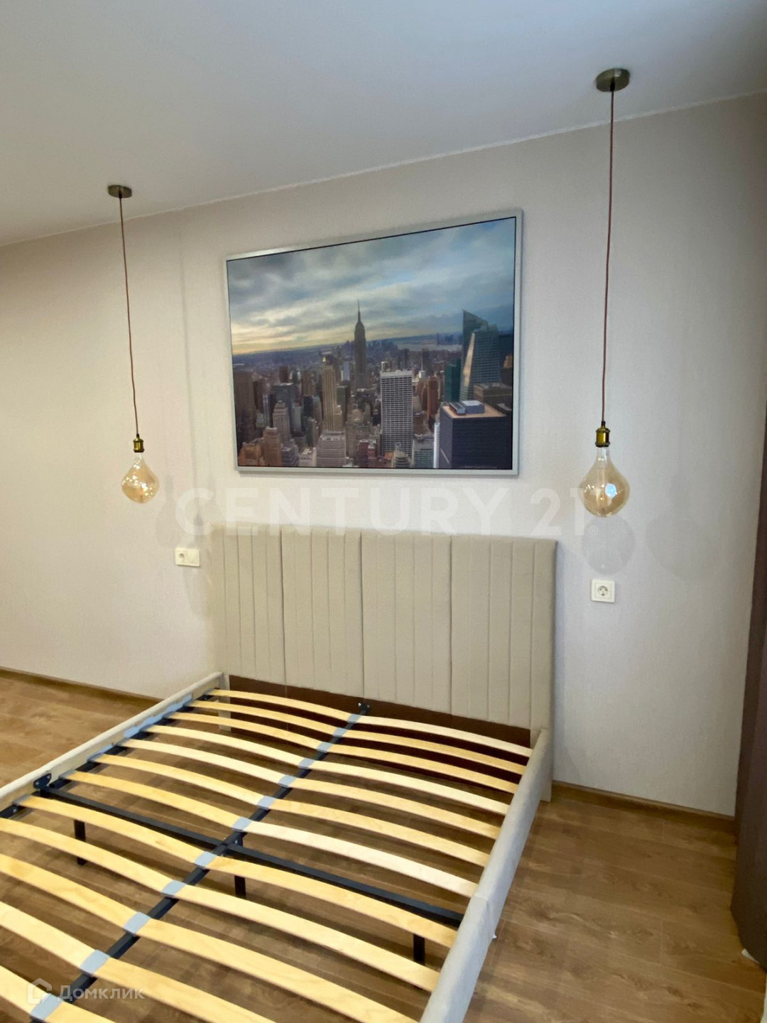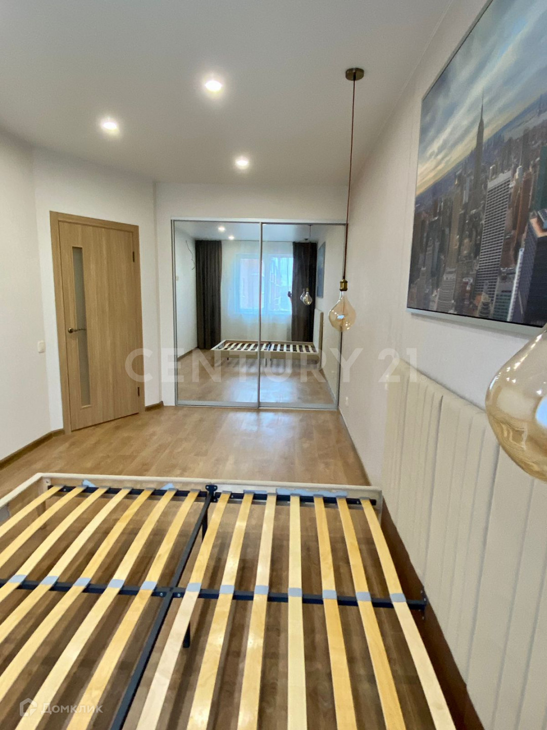 В комнате кровать и встроенный шкаф-купе.