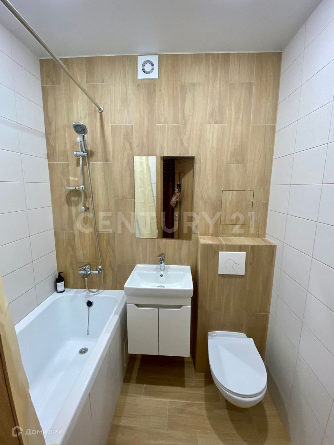 В санузле подвесная тумба с раковиной, акриловая ванна, подвесной унитаз.