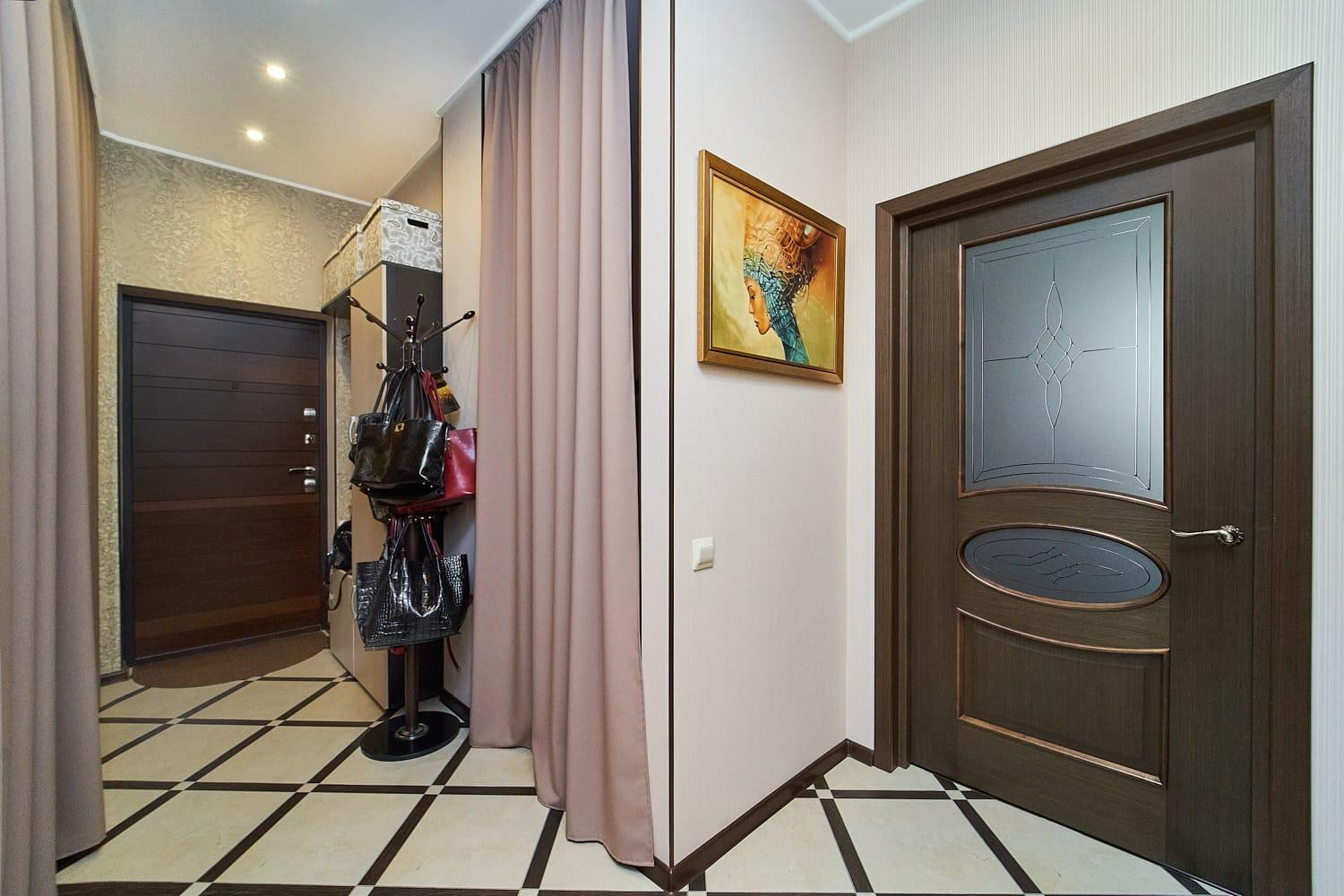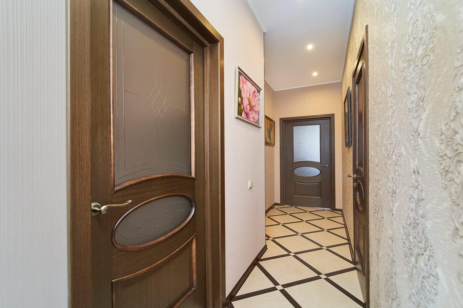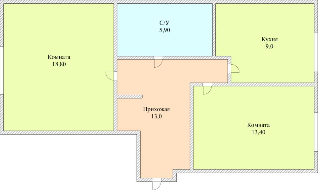 В продажи двухкомнатная квартира общей площадью 60,1 кв.м.: гостиная 18.8 кв.м, спальня 13.4 кв.м, кухня 9.0 кв.м, ванная 5.9 кв.м, коридор 13.0 кв.м с большими нишами под встроенные шкафы.
