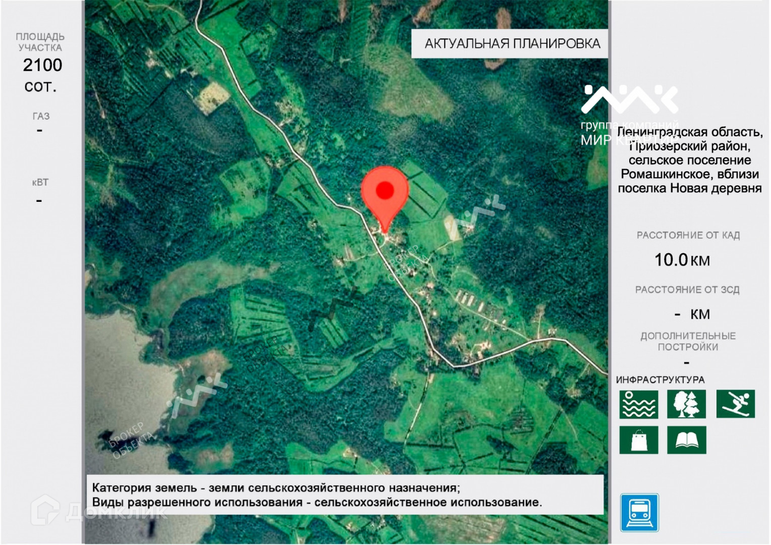 Арт. 3361104 Продаётся земельный участок. Площадью 21ГА. вблизи р. Вуокса. Участок сухой и ровный. Категория земли сельхоз назначения. Электричество есть, напряжение сети 220 В.  К объекту идёт грунтовая дорога.