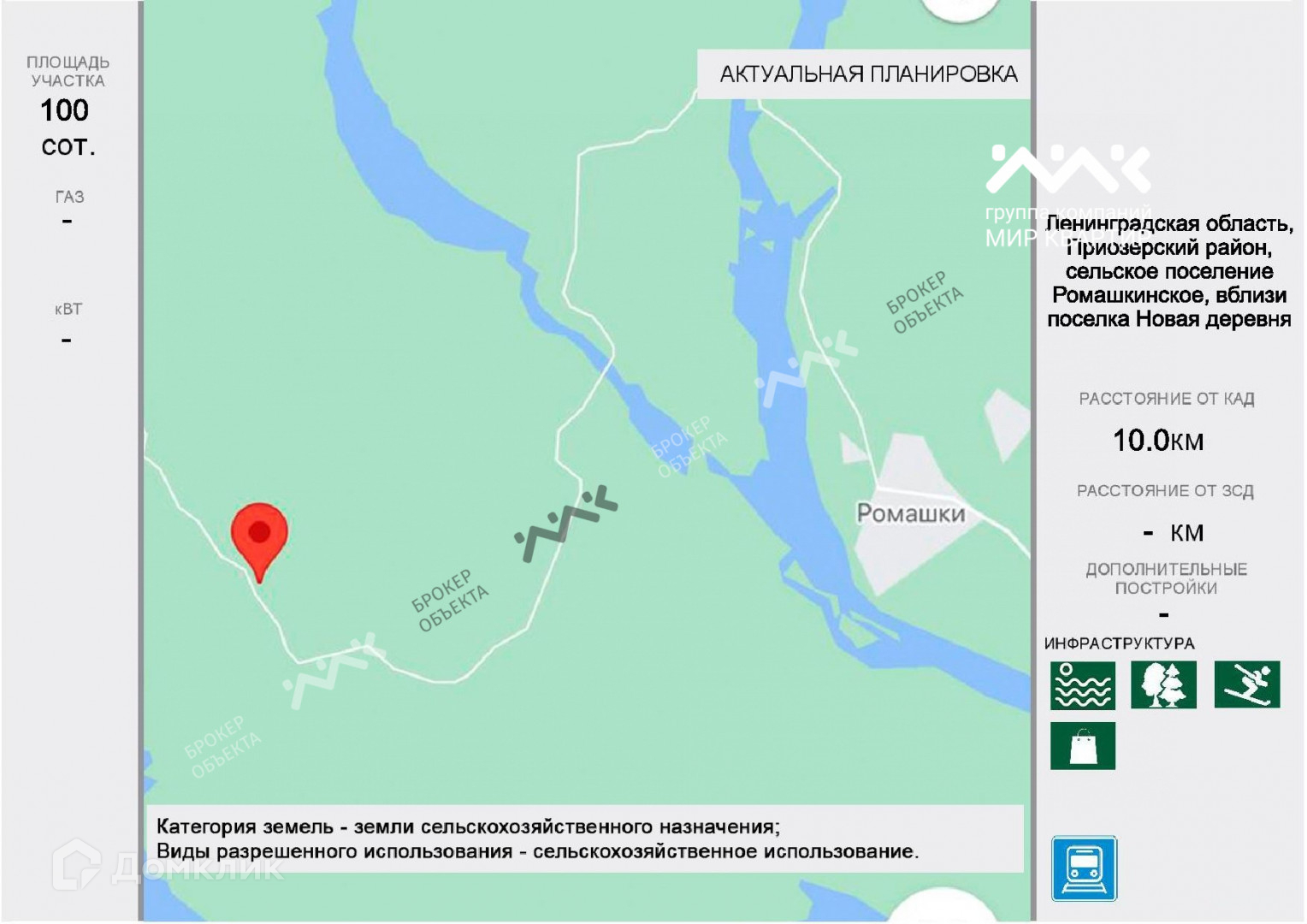 Арт. 3361118 Продаётся земельный участок в Приозерском р-не, с/п Ромашкинское , вблизи Новая деревня. Площадью 1ГА. Участок сухой и ровный. Категория земли сельхоз назначения. Идеально подходит под фермерское хозяйство. Электричество есть, напряжение сети 220 В.  К объекту идёт грунтовая дорога.