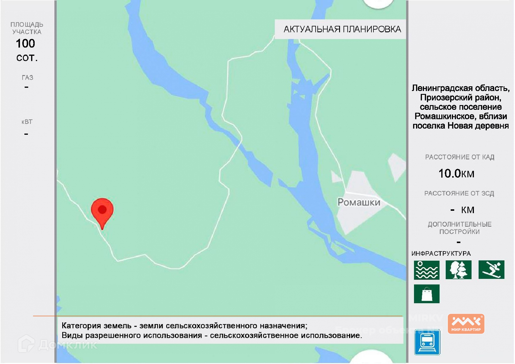 Арт. 3361118 Продаётся земельный участок в Приозерском р-не, с/п Ромашкинское , вблизи Новая деревня. Площадью 1ГА. Участок сухой и ровный. Категория земли сельхоз назначения. Идеально подходит под фермерское хозяйство. Электричество есть, напряжение сети 220 В.  К объекту идёт грунтовая дорога.