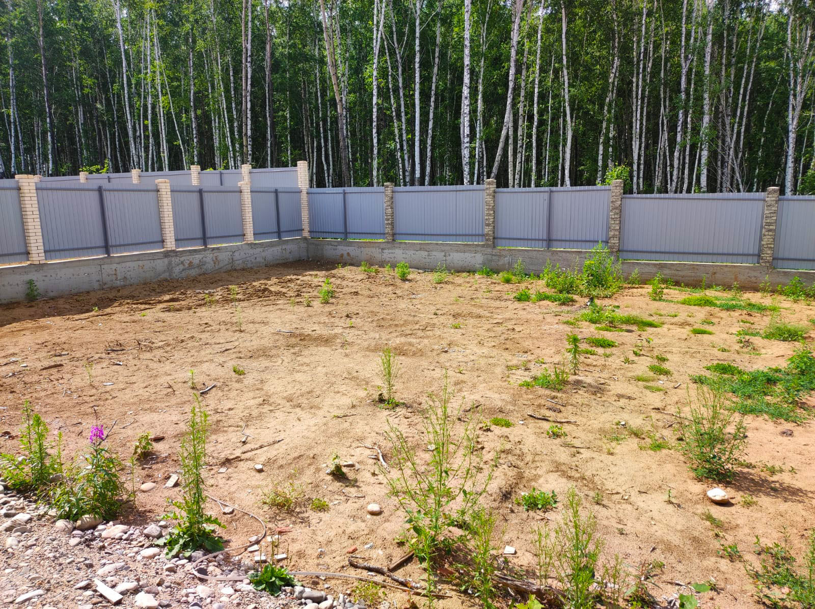 Участок огорожен, расположен у Березовой рощи, двор южный и просторный, позволит организовать уютную зону барбекю или оборудовать баню.