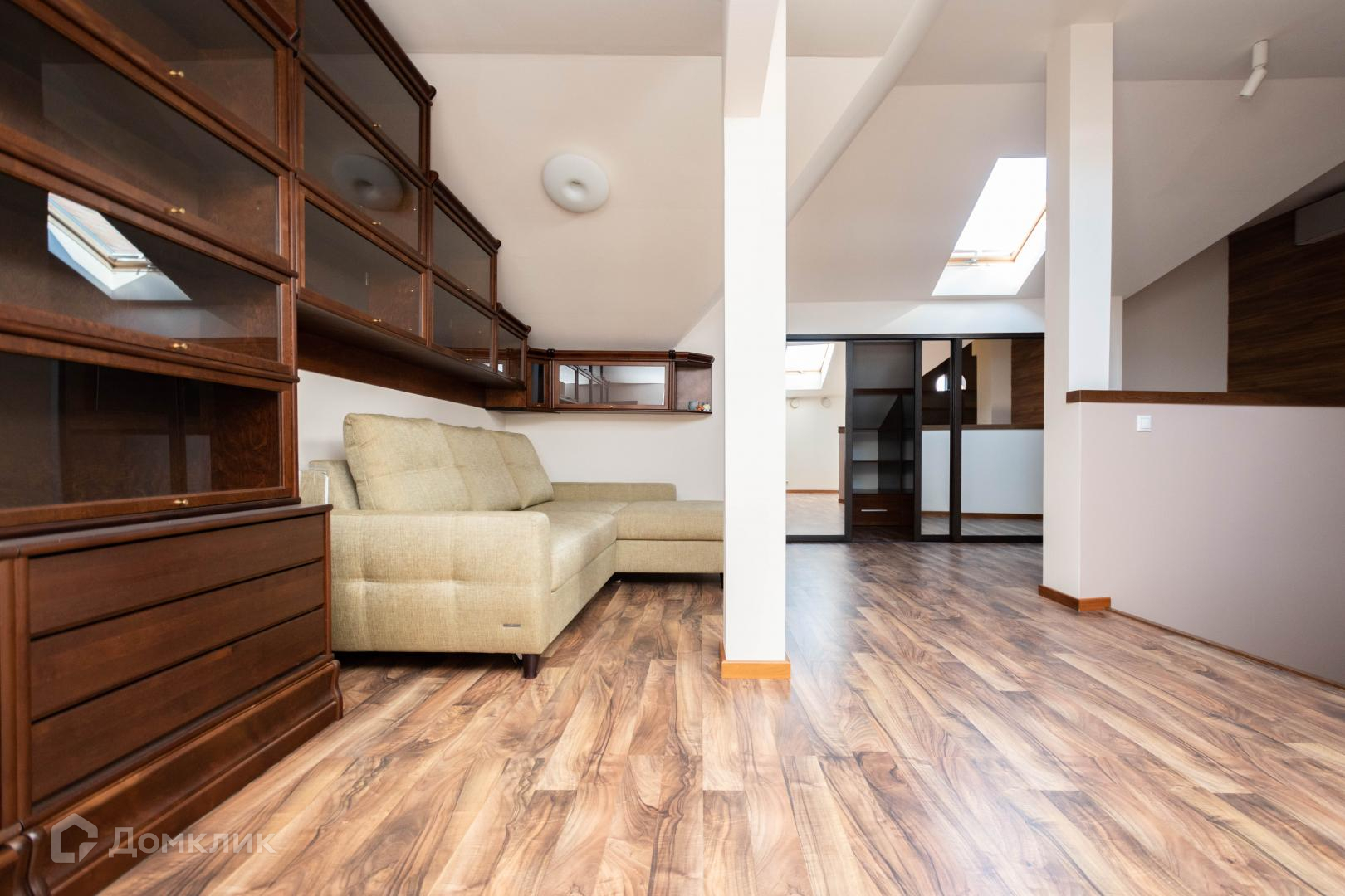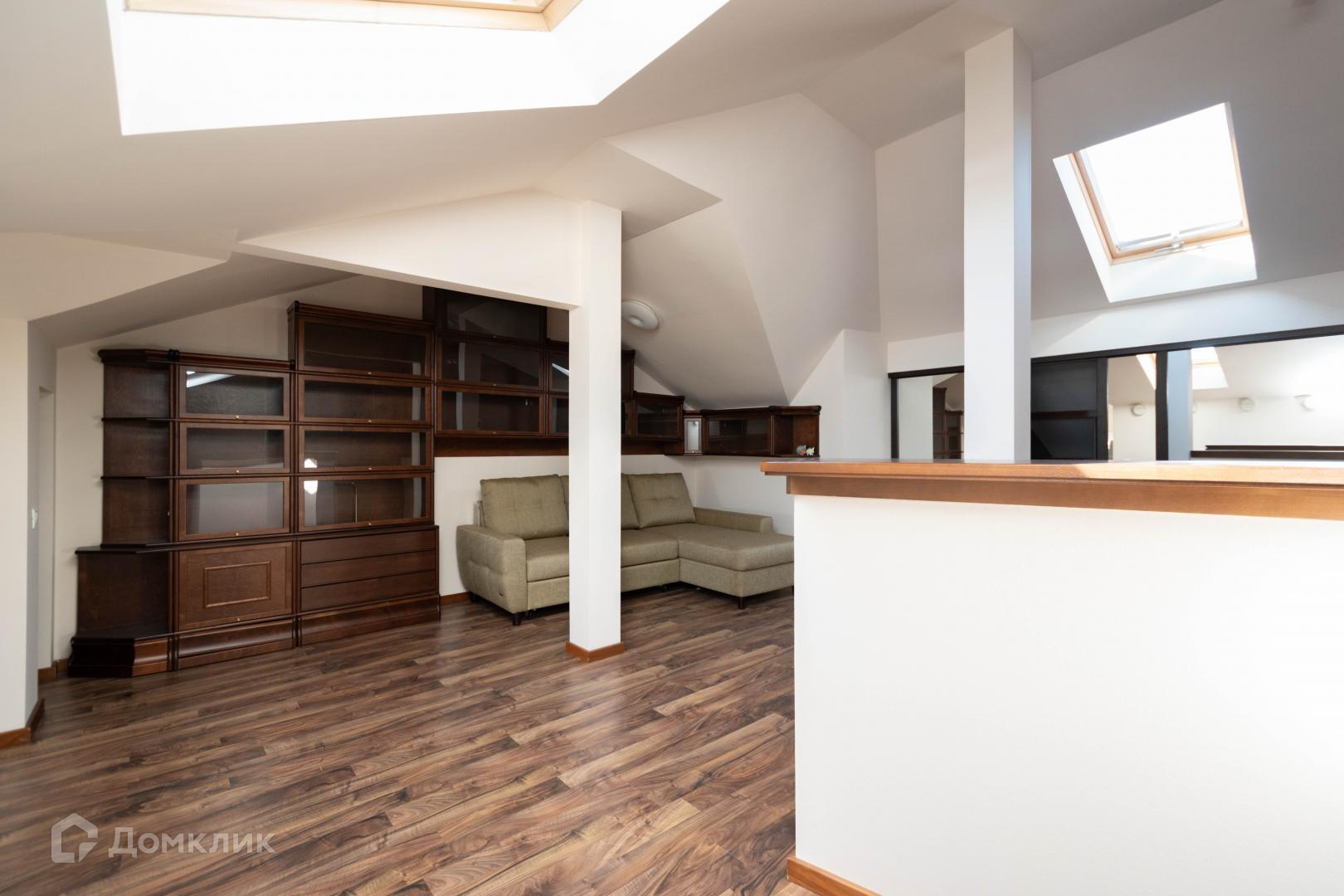 3.Таунхаус выполнен в 4 этажа, в цоколе расположены: сауна, санузел, прачечная, подсобные и бойлерные помещения и гараж. На первом этаже прихожая, зал-кухня, с выходом на балкон, комната отдыха с живым камином, второй санузел. Второй этаж состоит из спальных комнат (их три), еще двух санузлов и гардеробной. Третий этаж — мансардный, с него открывается романтичный вид на залив, там пространство организовано и для работы, и для занятий спортом и для отдыха, и для хранения
