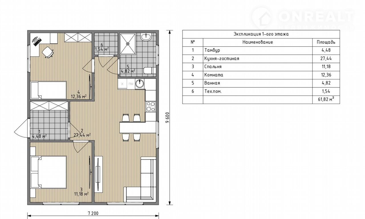 Общая площадь 61.8 м2