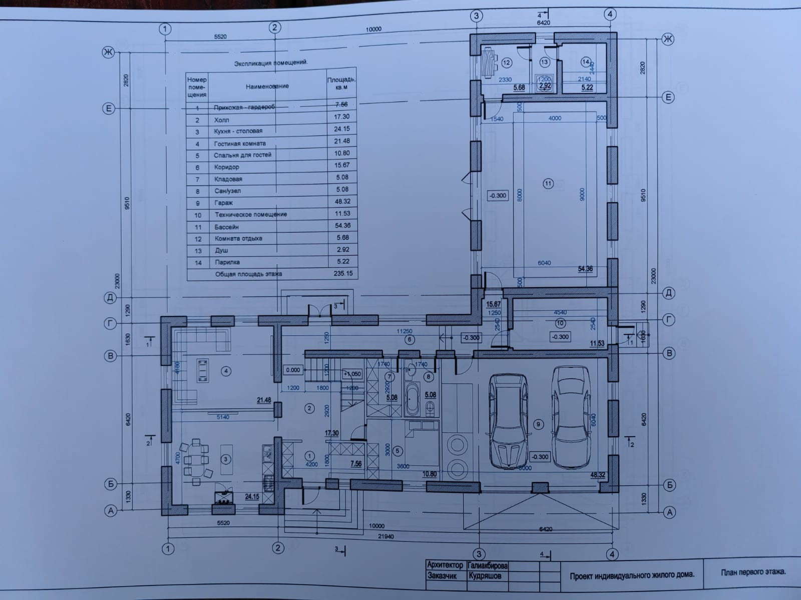 На первом этаже находятся кухня и гостиная, комната для гостей, гараж на два автомобиля, баня, бассейн, кладовая, сан. узел и техническое помещение котельной с оборудованием для эксплуатации бассейна.