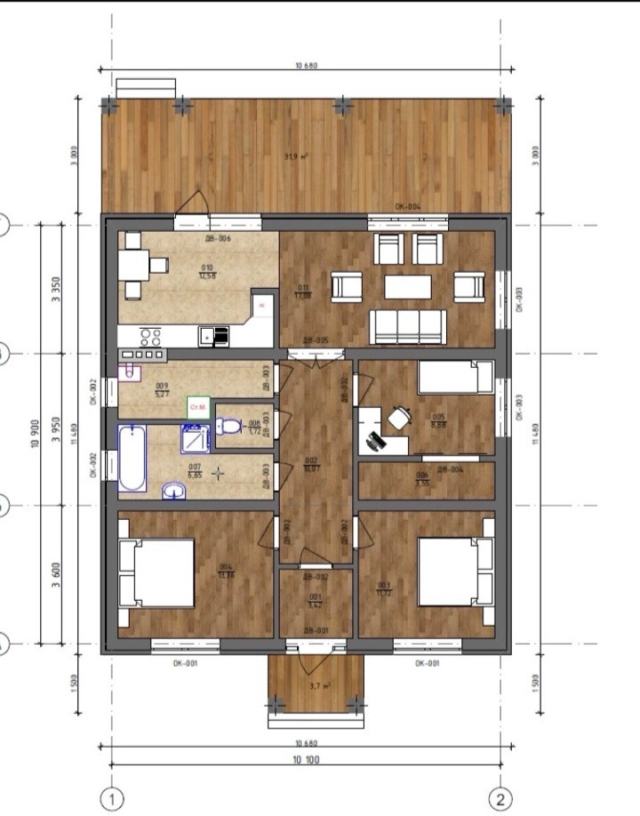 В доме три комнаты, просторная гостиная, два санузла, терасса.
