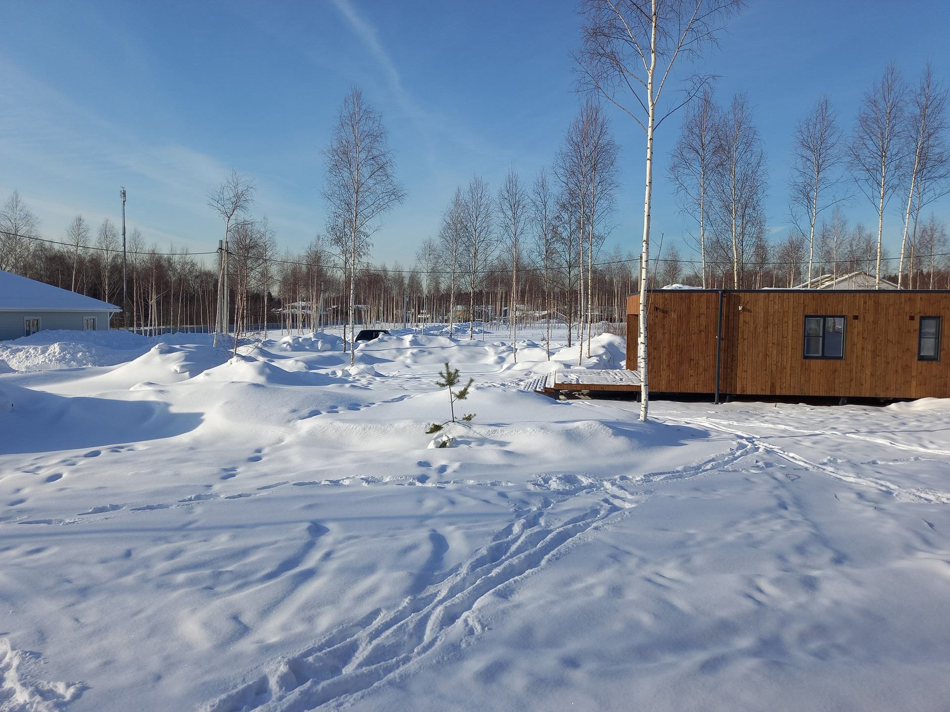 До участка асфальтированная дорога. Участок сухой, ровный, с березками. Рядом выход в лес. Рядом школы, детский сад, магазины.