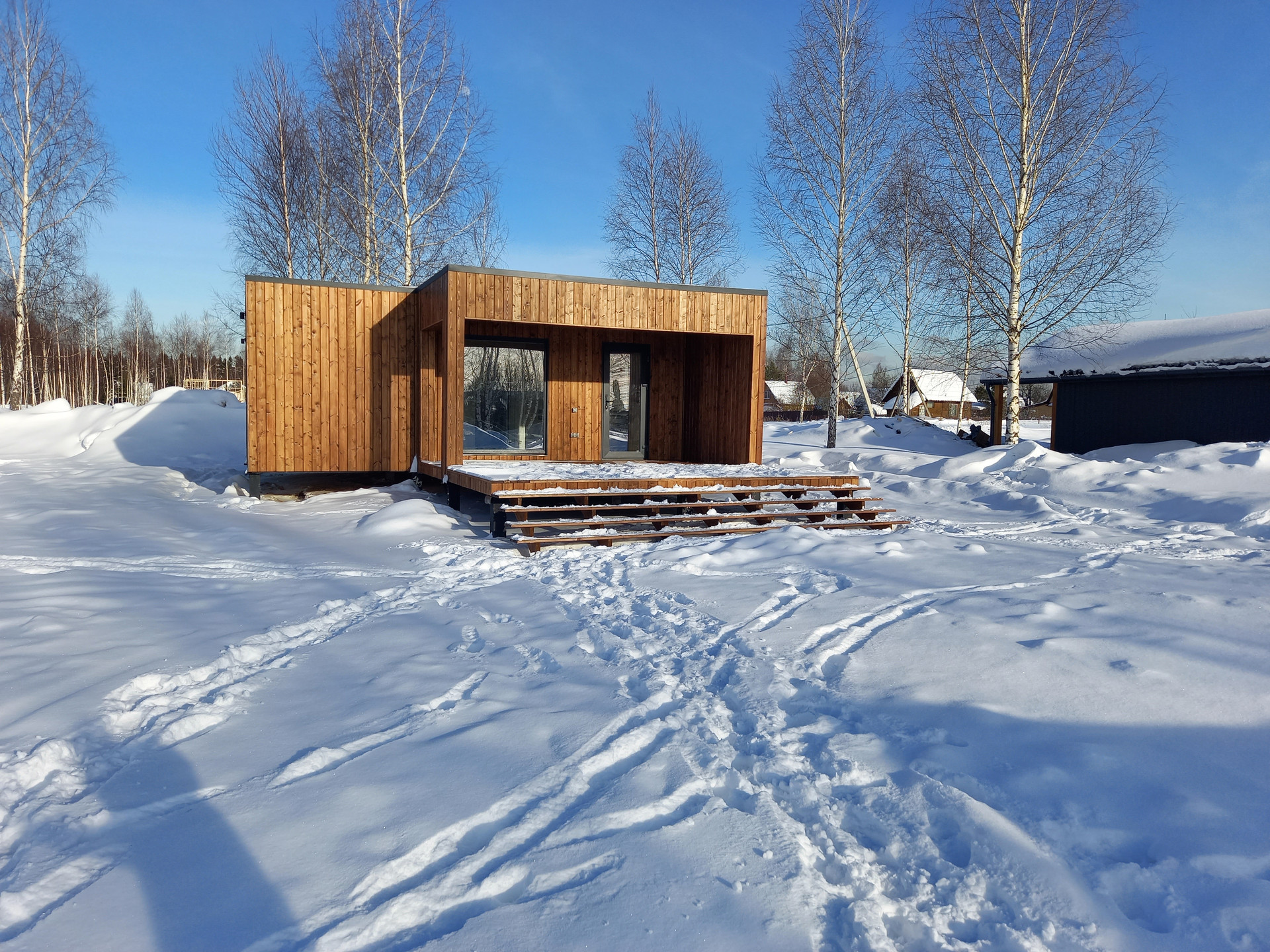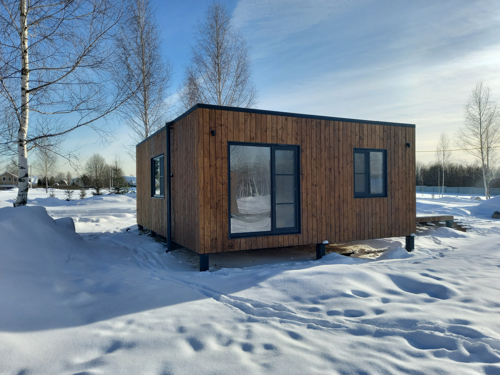 Дом площадью 61,42 кв. м. построен по каркасно-щитовой технологии, состоит из 5 модулей.