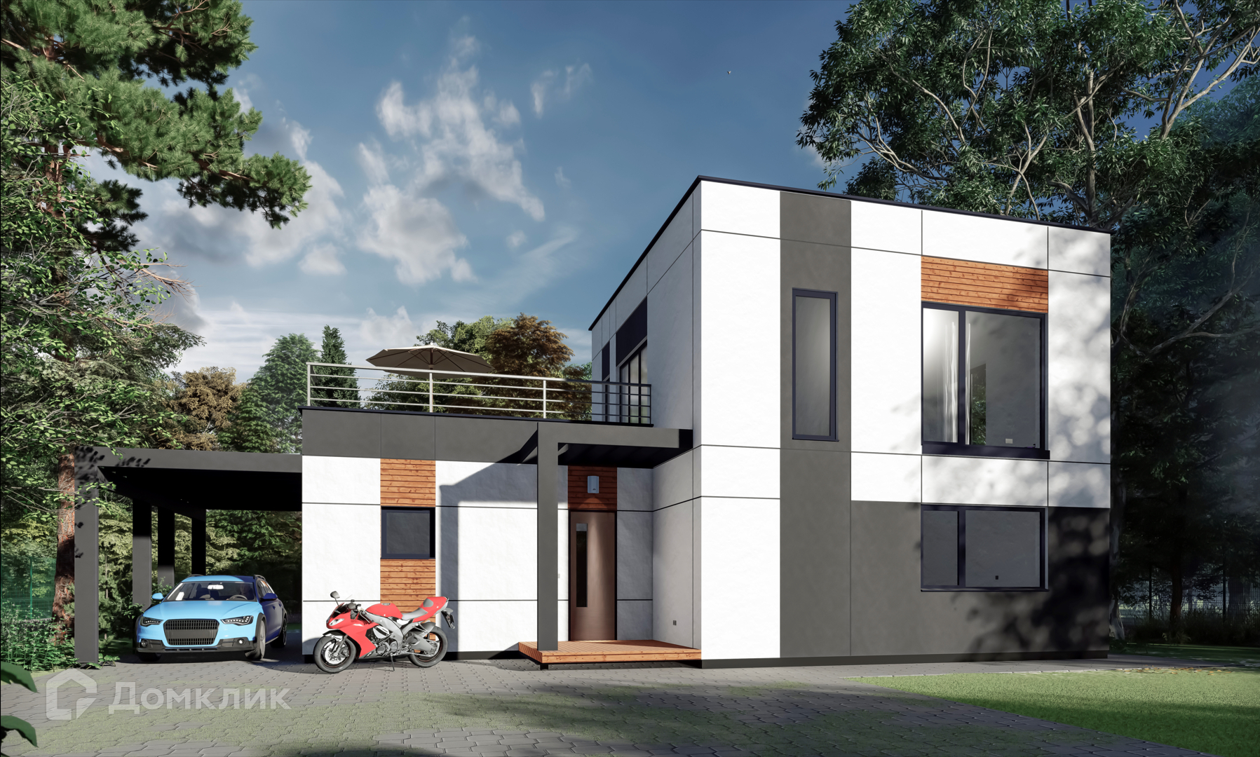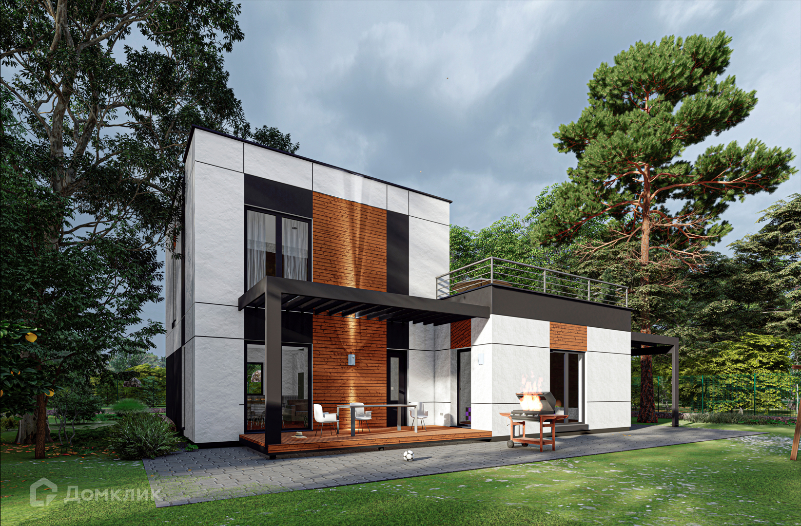 Внешняя отделка дома - Фасад дома окрашен в цвет графитово - серых и белых оттенков Выполнены декоративные вставки из планкена под дерево (ДПК — древесно-полимерный композит). Профили стеклопакетов окрашены в цвет фасада (наружная часть ceporo цвета, внутренняя - белого цвета).