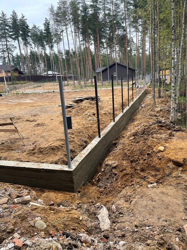 Под забор установлены отличный ленточный фундамент и столбы из профильной трубы. Фундамент под забор обработан гидроизоляцией, трубы загрунтованы.