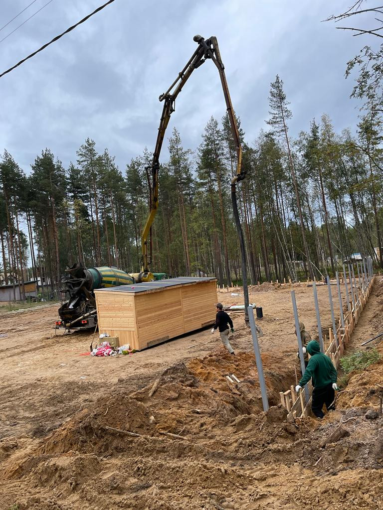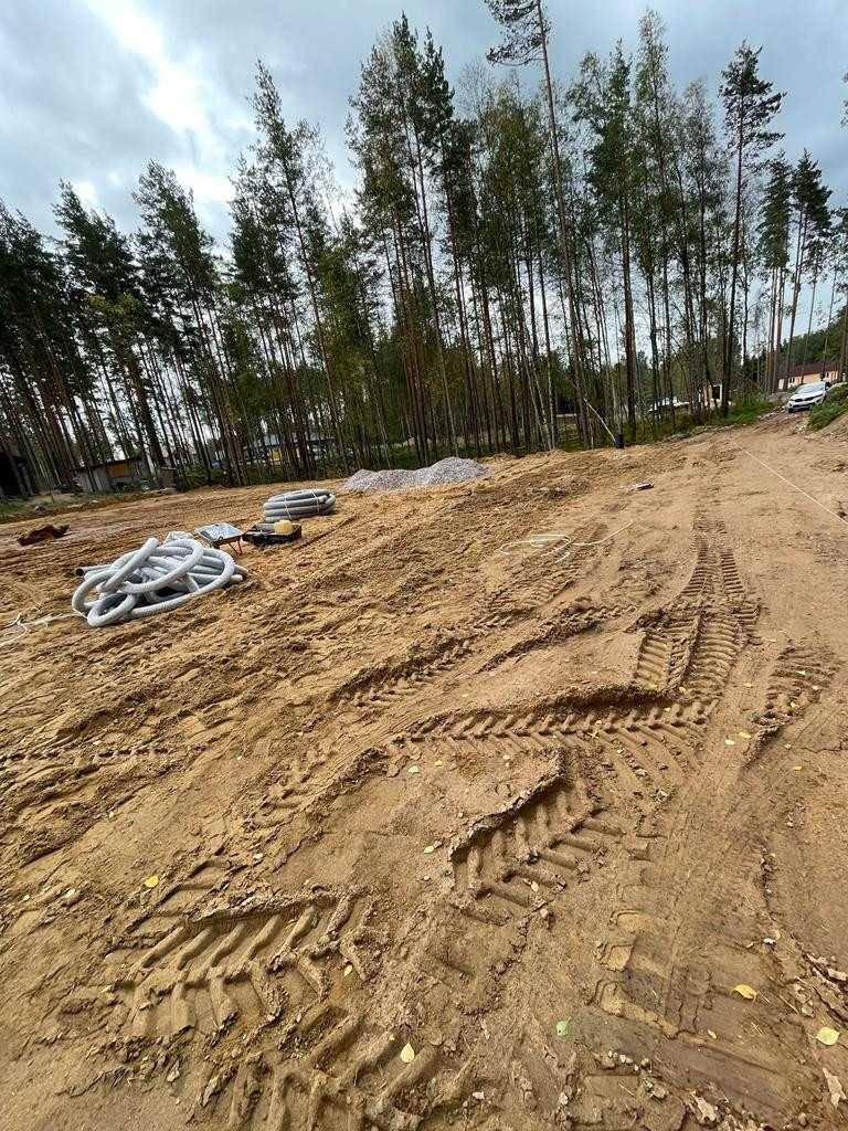 На участке выполнен большой объем работы по подготовке участка к строительству: раскорчевка деревьев, замена грунта на песок  глубиной до 1,6 метров. Подготовлено место для заливки фундамента под  дом -строительный песок на геотекстиле глубиной до 3 метров. Размер предполагаемого фундамента ширина 11 метров длина 23 метра.