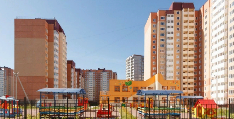 Придомовая территория благоустроена зелеными зонами и прогулочными дорожками. Двор разделен на зоны отдыха для взрослых и детей, а спортивные и игровые площадки подходят для всех возрастов.