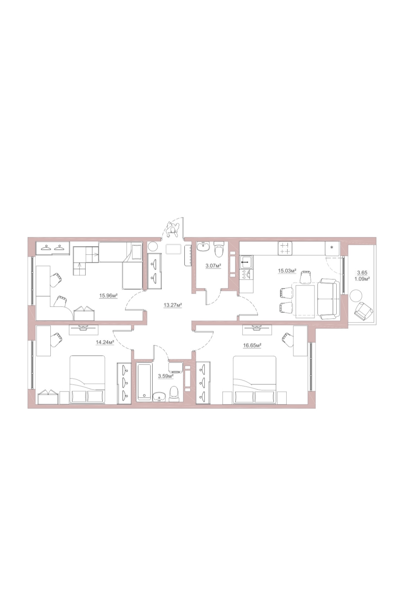 Большая кухня 15 метров с выходом на балкон 3,6 м. Комнаты 16,9 + 16,6 + 14,2.