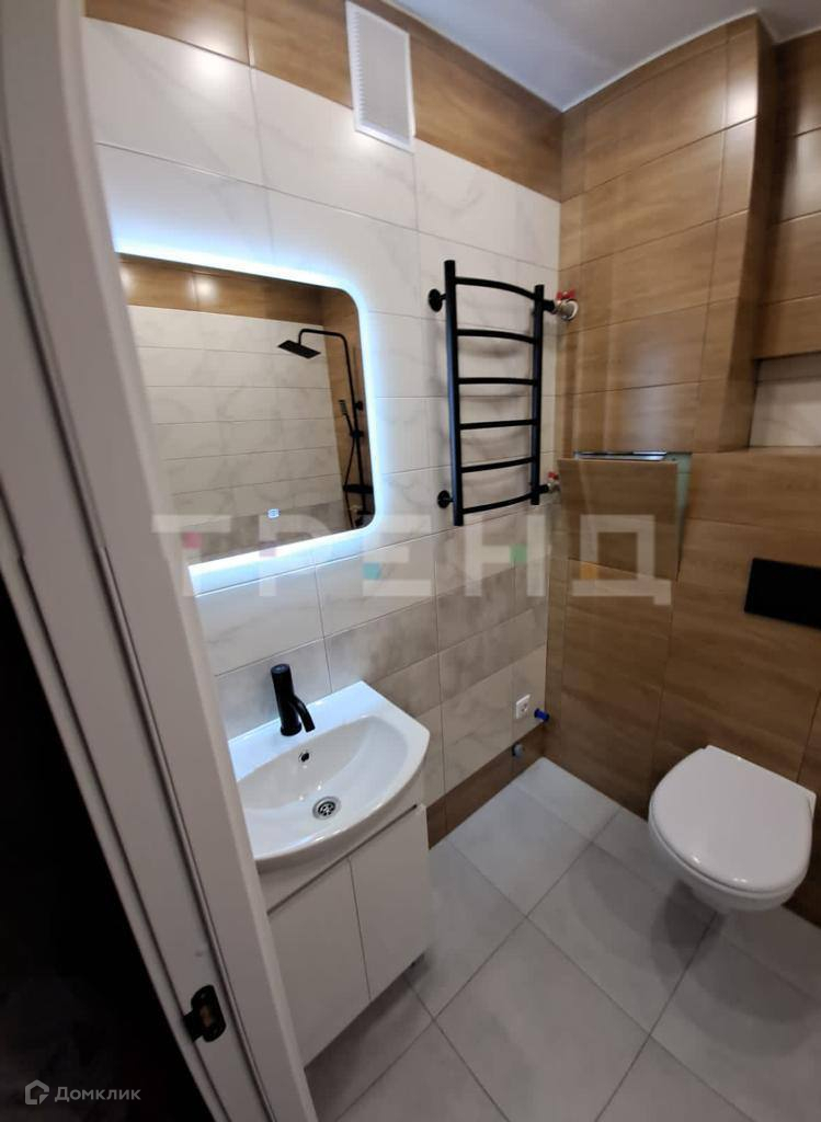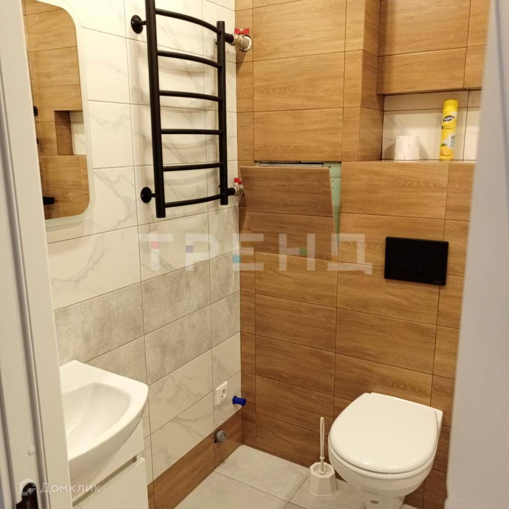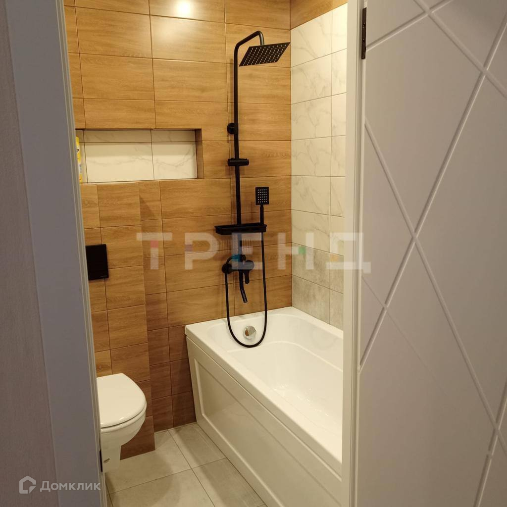 В ванной комнате установлены красивые кафельные плитки, а также сантехника нового поколения, обеспечивающая комфорт и функциональность. Черные элементы в интерьере добавляют шика и подчеркивают красоту и грацию помещения. Комната оформлена с натяжными потолками и высококачественным ламинатом на полу. Стены украшены обоями.