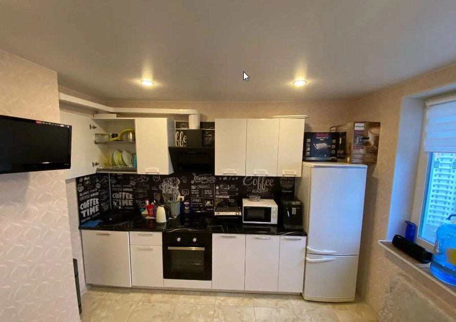 На кухне современный кухонный гарнитур, в спальне натяжной потолок с хорошим освещением.