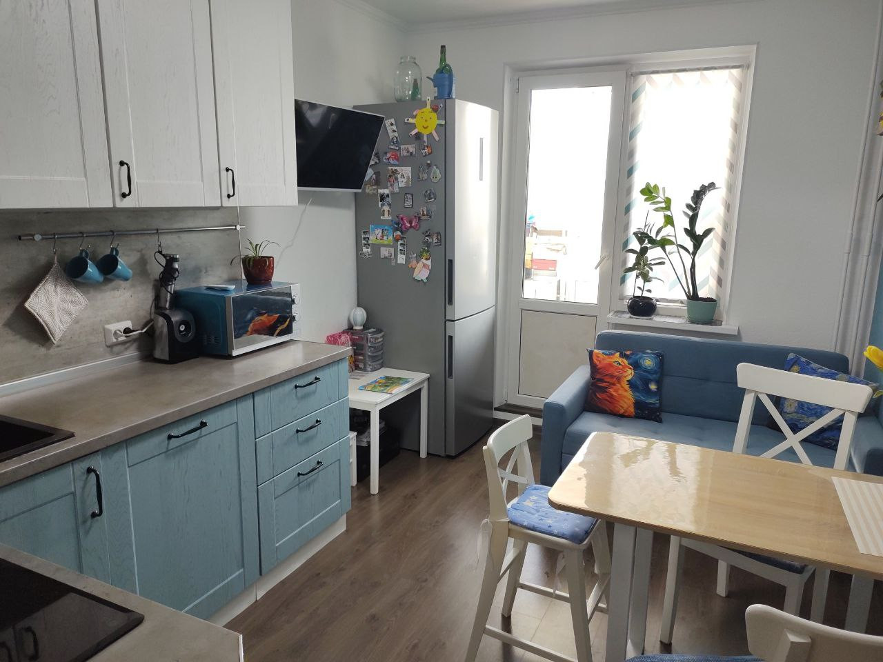 Квартира светлая, с качественным ремонтом, квадратная кухня с встроенной мебелью ( продается без техники, только мебель + стол и 2 стула), с выходом на остекленный балкон. Просторная комната с двухспальной кроватью, большим окном. Совмещенный санузел с ванной. В коридоре есть большой шкаф для вещей. Окна квартиры выходят во двор, высокий этаж - красивые видовые характеристики.