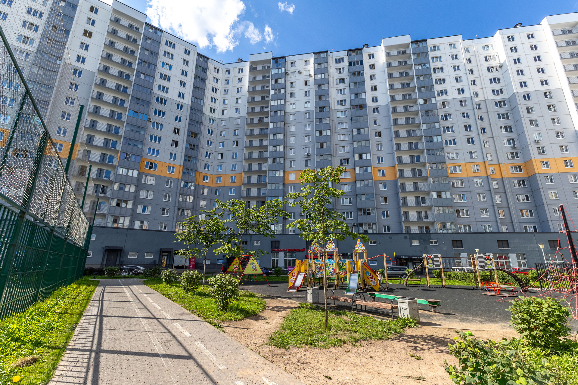 ЖК расположен в новой части Ломоносовского района. Во дворе детская площадка, велодорожки, стадион, на первых этажах всевозможные магазины, предусмотрена открытая парковка, рядом есть подземный паркинг. В холле дома Вас ожидают два лифта (1 грузовой и 1 пассажирский).