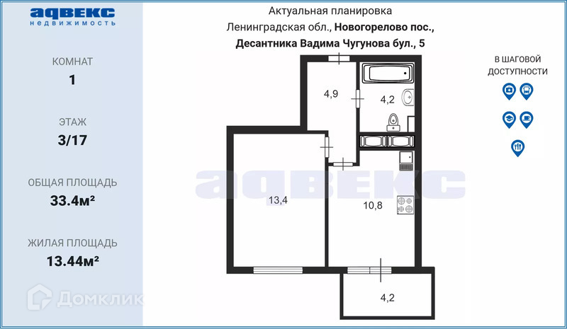 1-комнатная квартира, 33.4 м2, этаж 3 / 17, на продажу в посёлке Новогорелово, бульвар Десантника Вадима Чугунова, 5