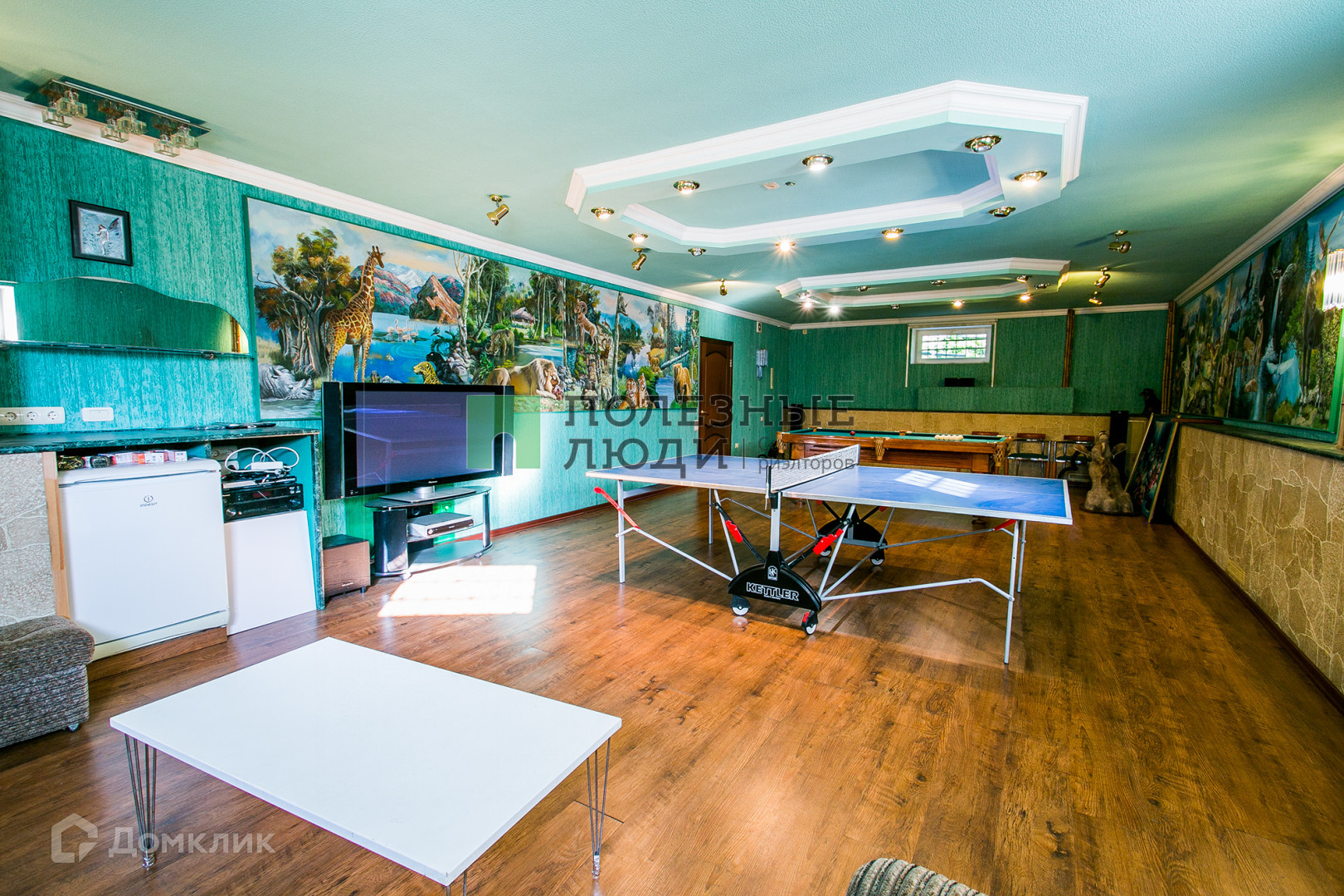 Цокольный этаж. Просторная комната отдыха 64 кв. м с бильярдом и спортивным уголком с тренажерами. Комната оборудована и под домашний кинотеатр.