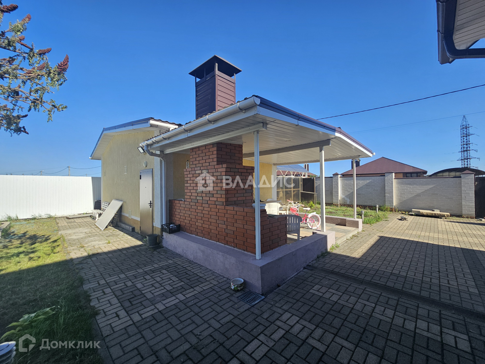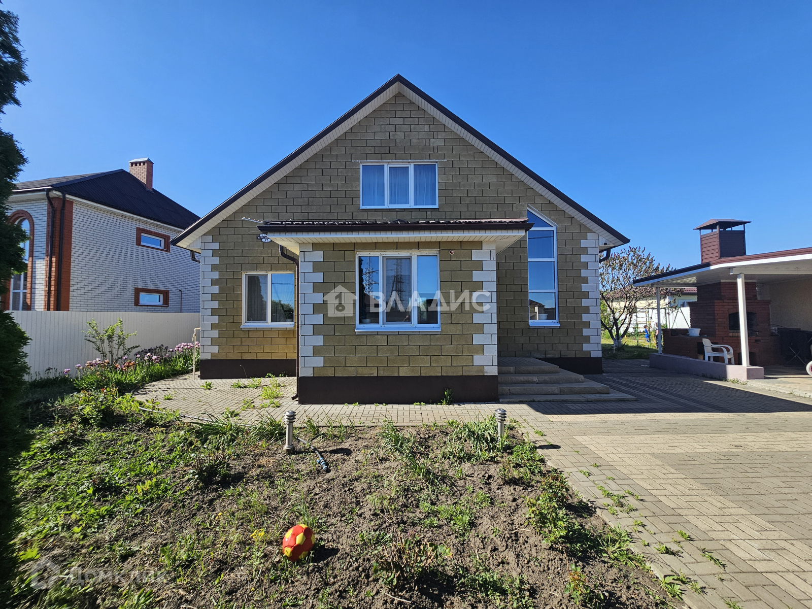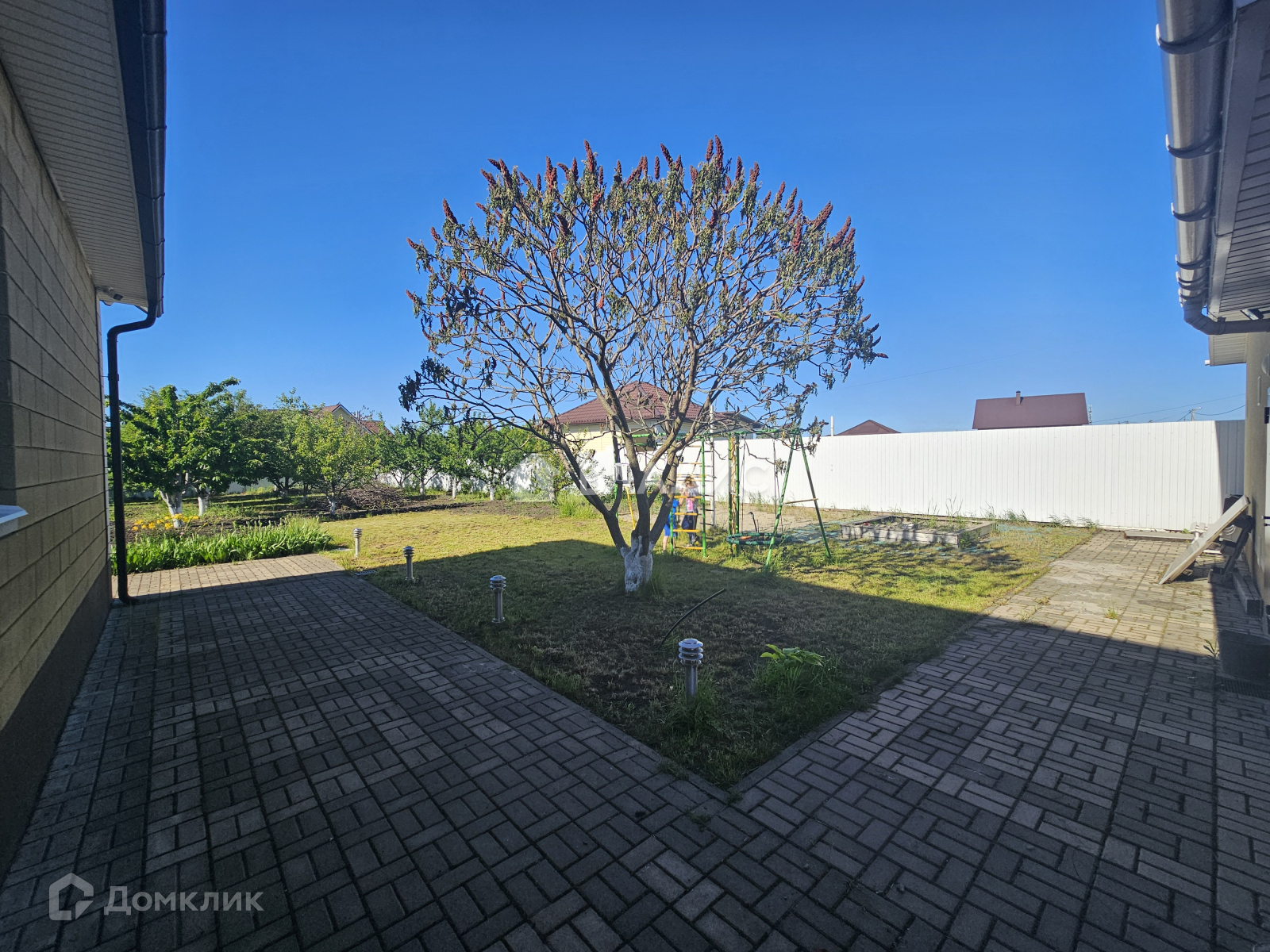 Участок без уклона, зонирован, огорожен и благоустроен, как внутри так и снаружи. На нём имеется крытая летняя обеденная зона с барбекю, детская площадка, здоровый сад с плодовыми деревьями,  навес для авто, автоматические ворота.