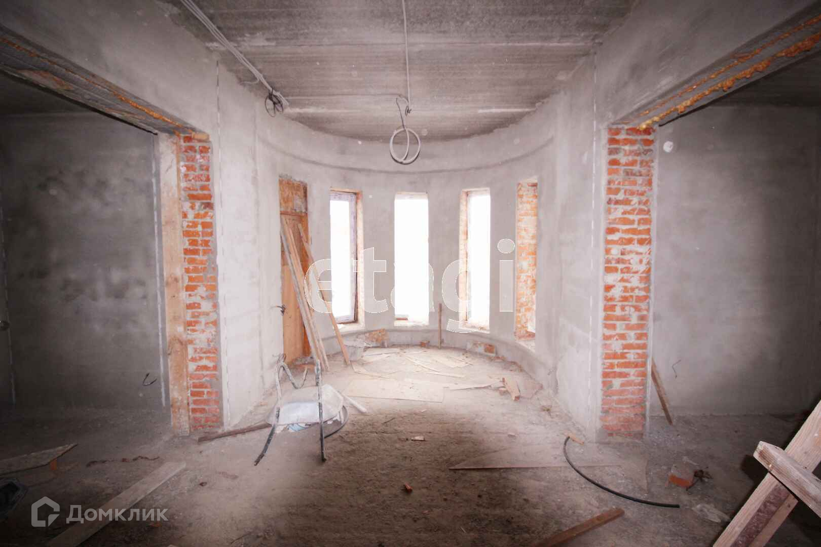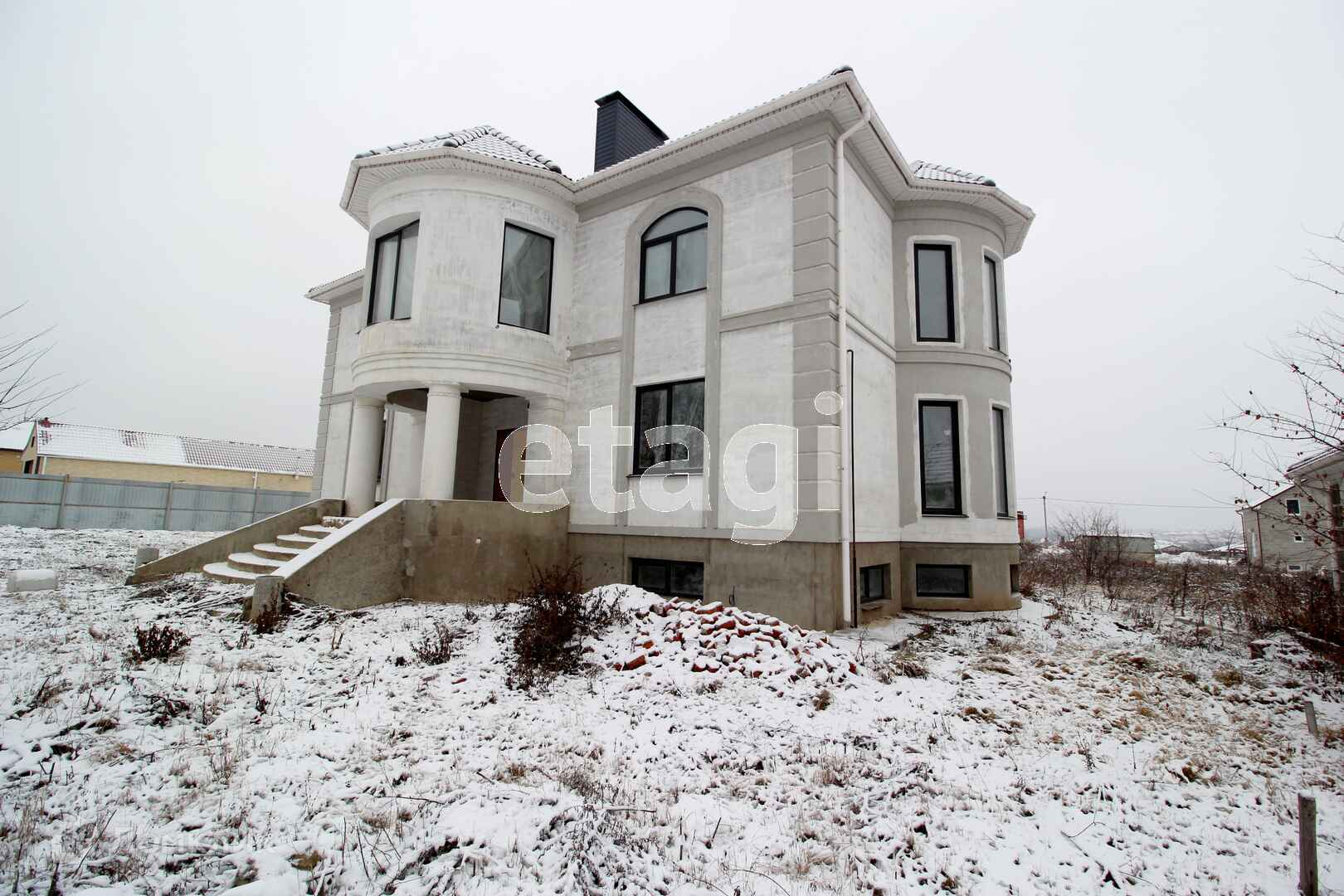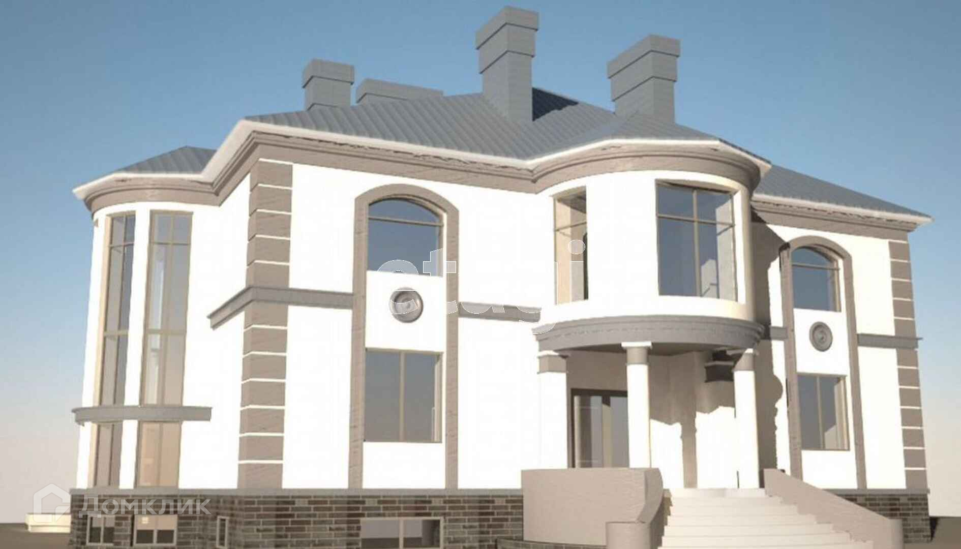 Дом белокаменный с красивыми колоннами, эркер, с панорамными витражными окнами.