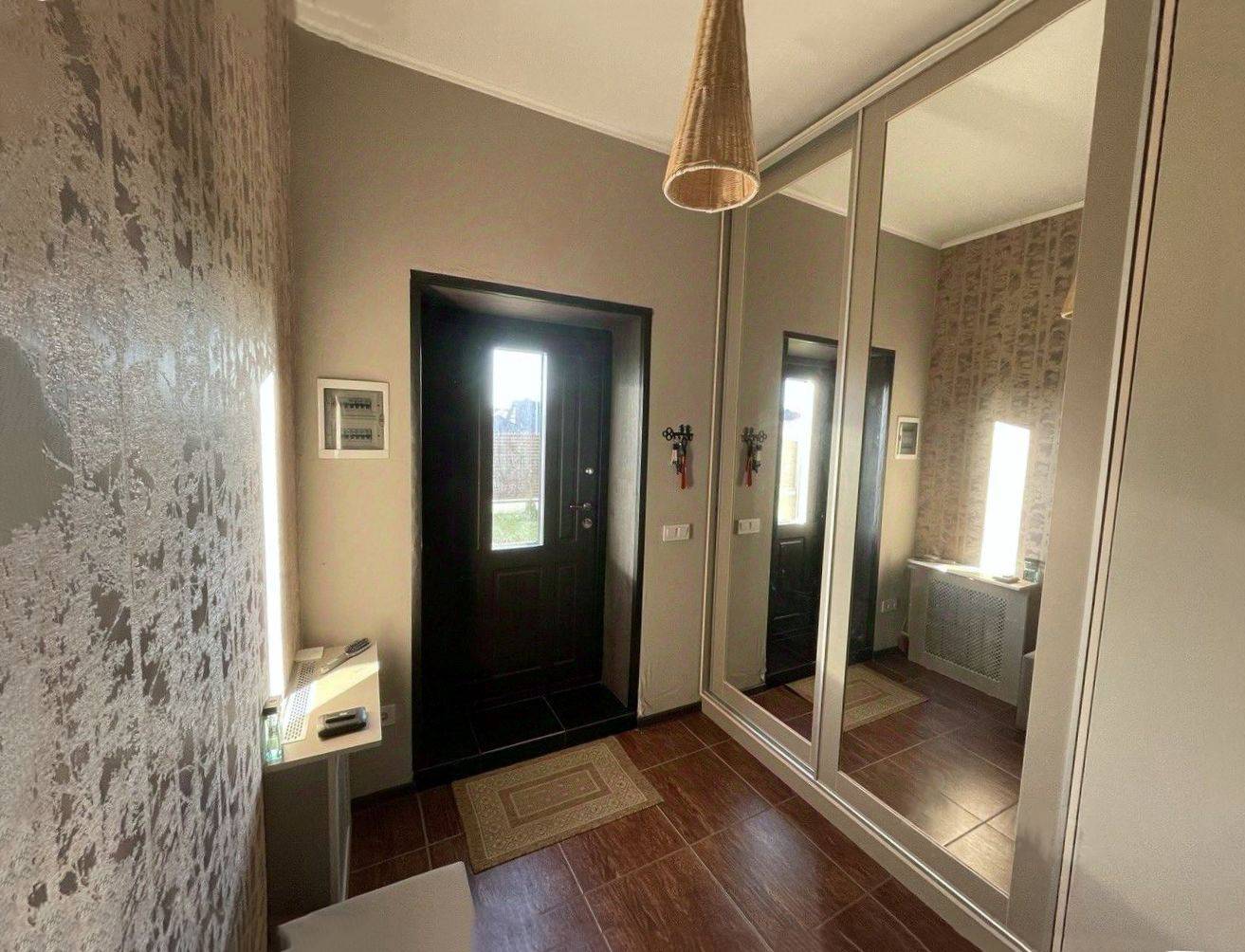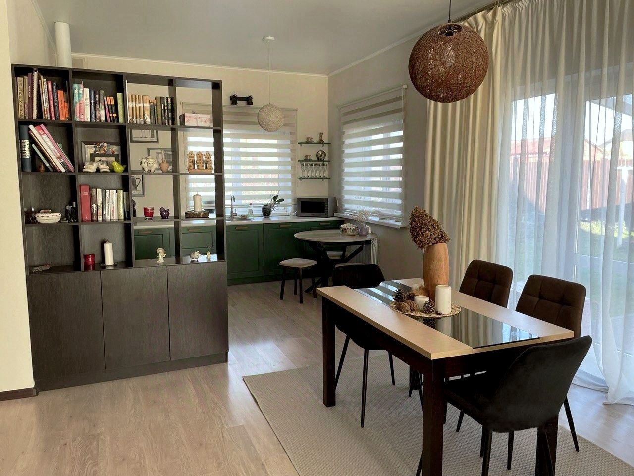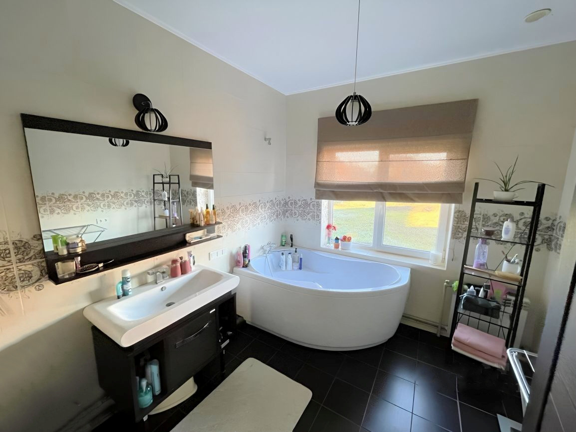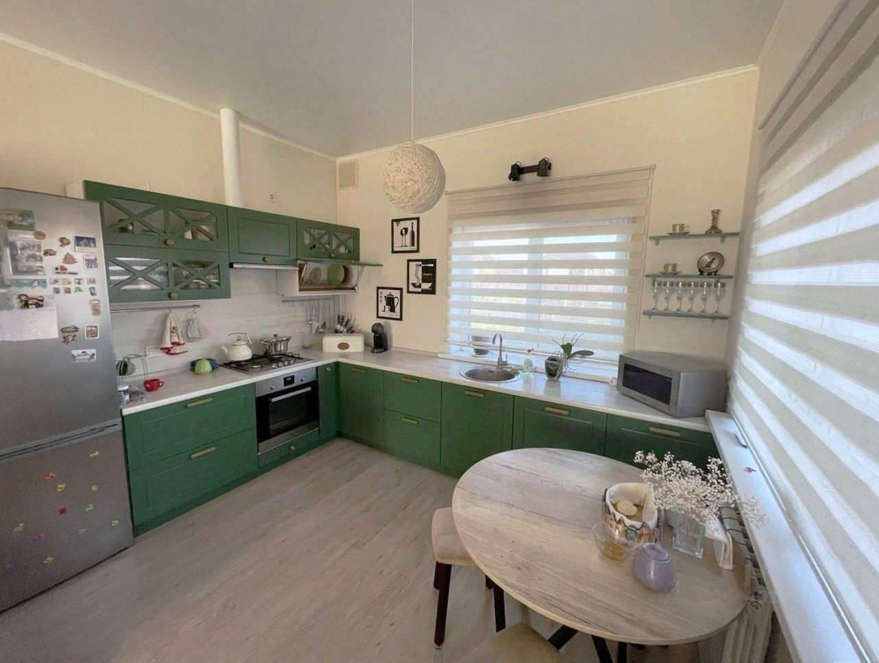 - В доме 3 изолированные комнаты, просторная гостиная, совмещенная с кухней, большая ванная комната, отдельный туалет в котельной. Все комнаты светлые, в гостиной — окна в пол. Кроме основного входа в дом есть выход на террасу из гостиной и еще один выход на задний двор. Дом продается с мебелью, включая уличную на террасе (IKEA). На кухне есть вся техника, вкл. посудомойку (Bosh), фасады из мдф. Котел Baxi (Италия).
