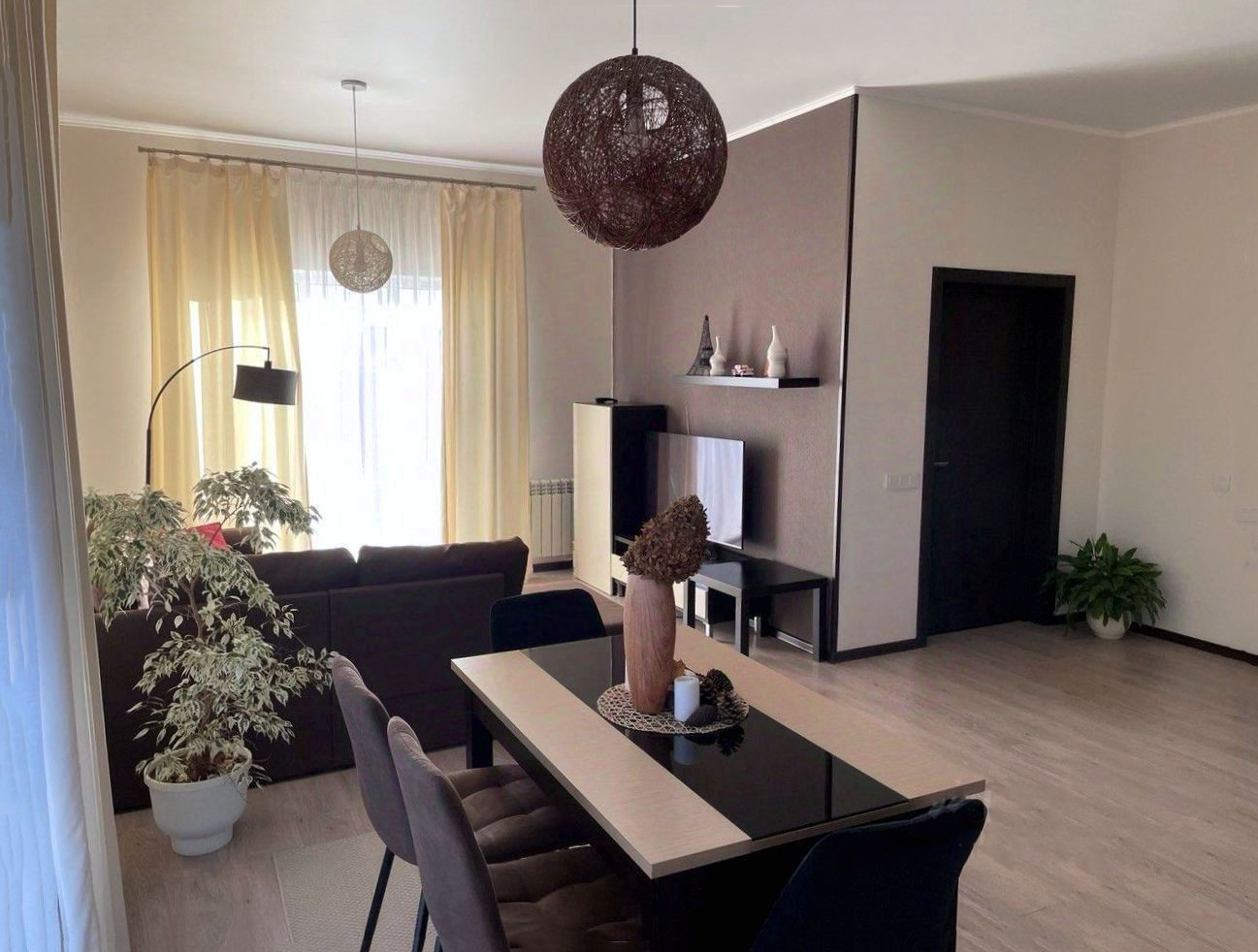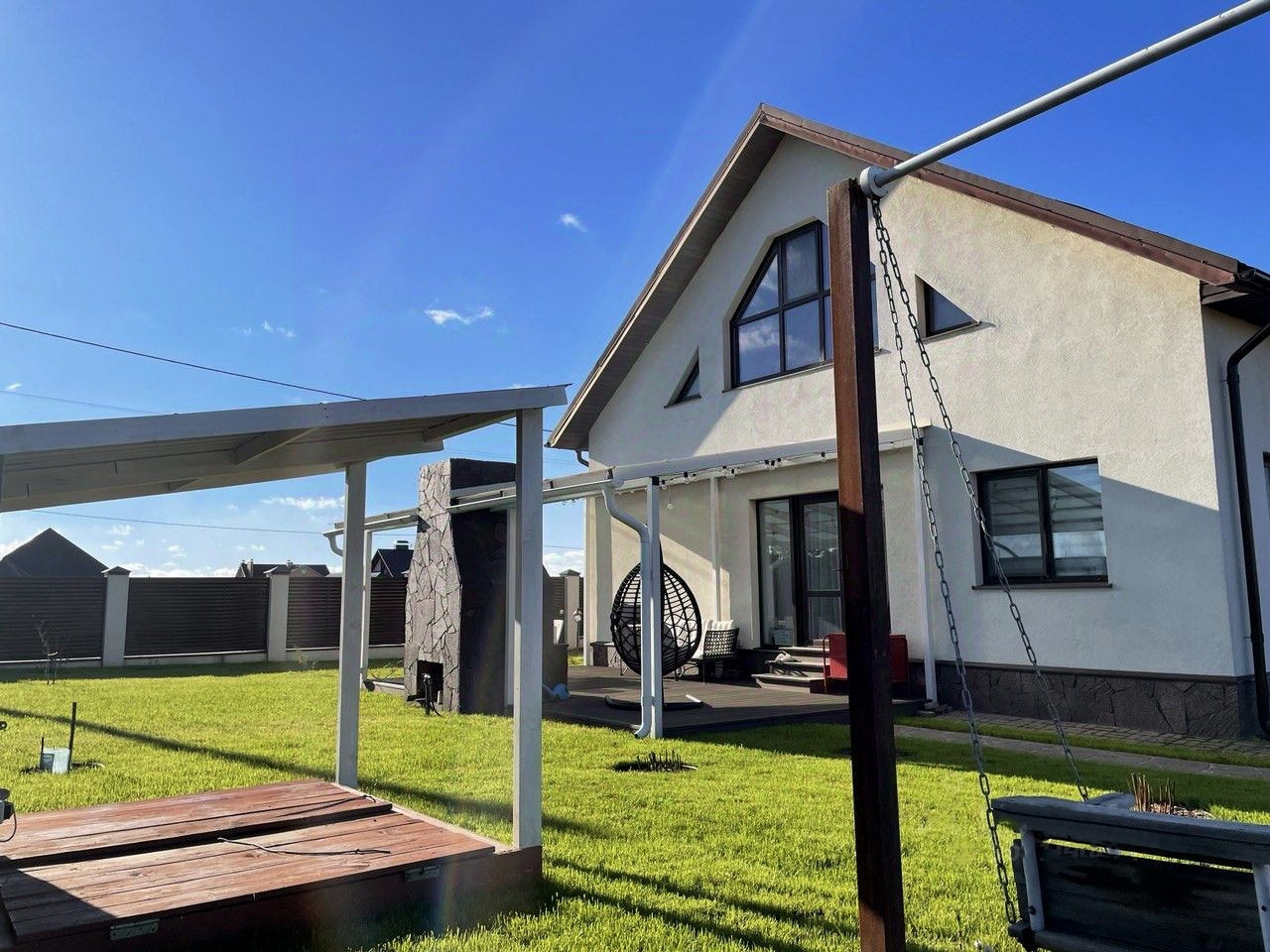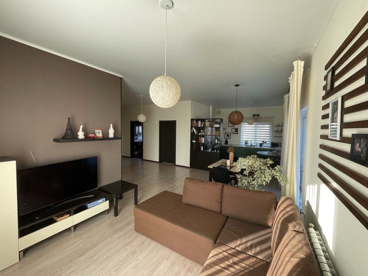 - В доме 3 изолированные комнаты, просторная гостиная, совмещенная с кухней, большая ванная комната, отдельный туалет в котельной. Все комнаты светлые, в гостиной — окна в пол. Кроме основного входа в дом есть выход на террасу из гостиной и еще один выход на задний двор. Дом продается с мебелью, включая уличную на террасе (IKEA). На кухне есть вся техника, вкл. посудомойку (Bosh), фасады из мдф. Котел Baxi (Италия).
