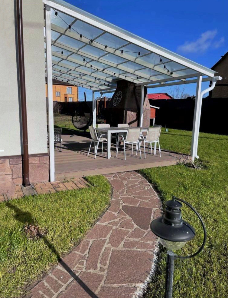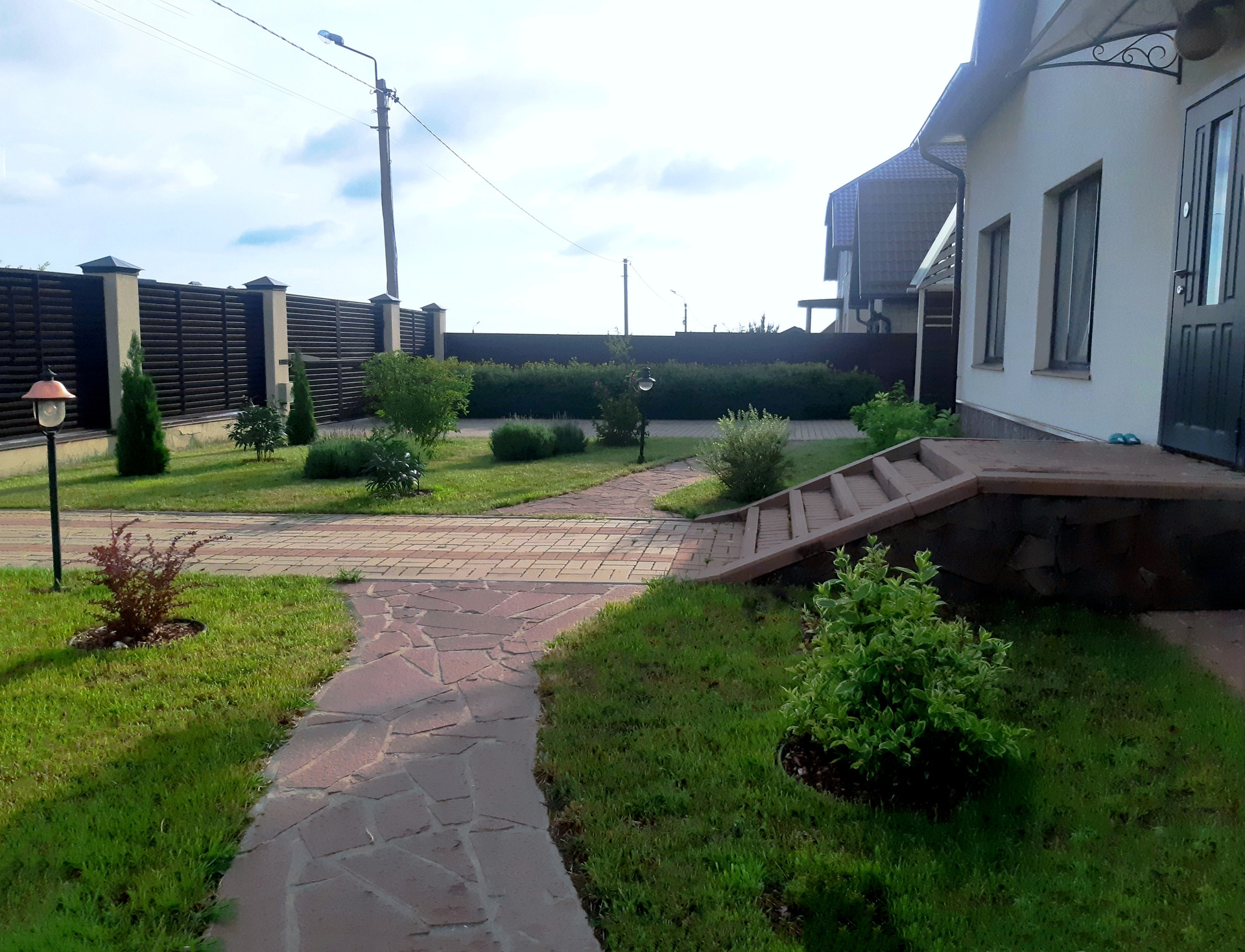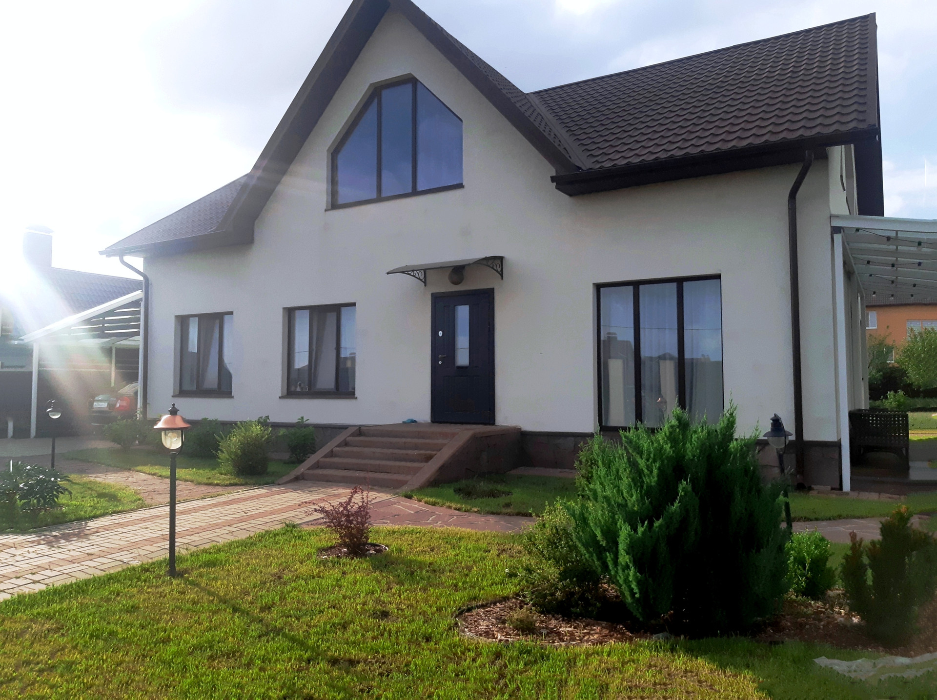 - Благоустроенный двор с декоративным озеленением и освещением. Во дворе навес для машины (24 кв. м.) и пристройка для хозяйственных нужд (16 кв. м).