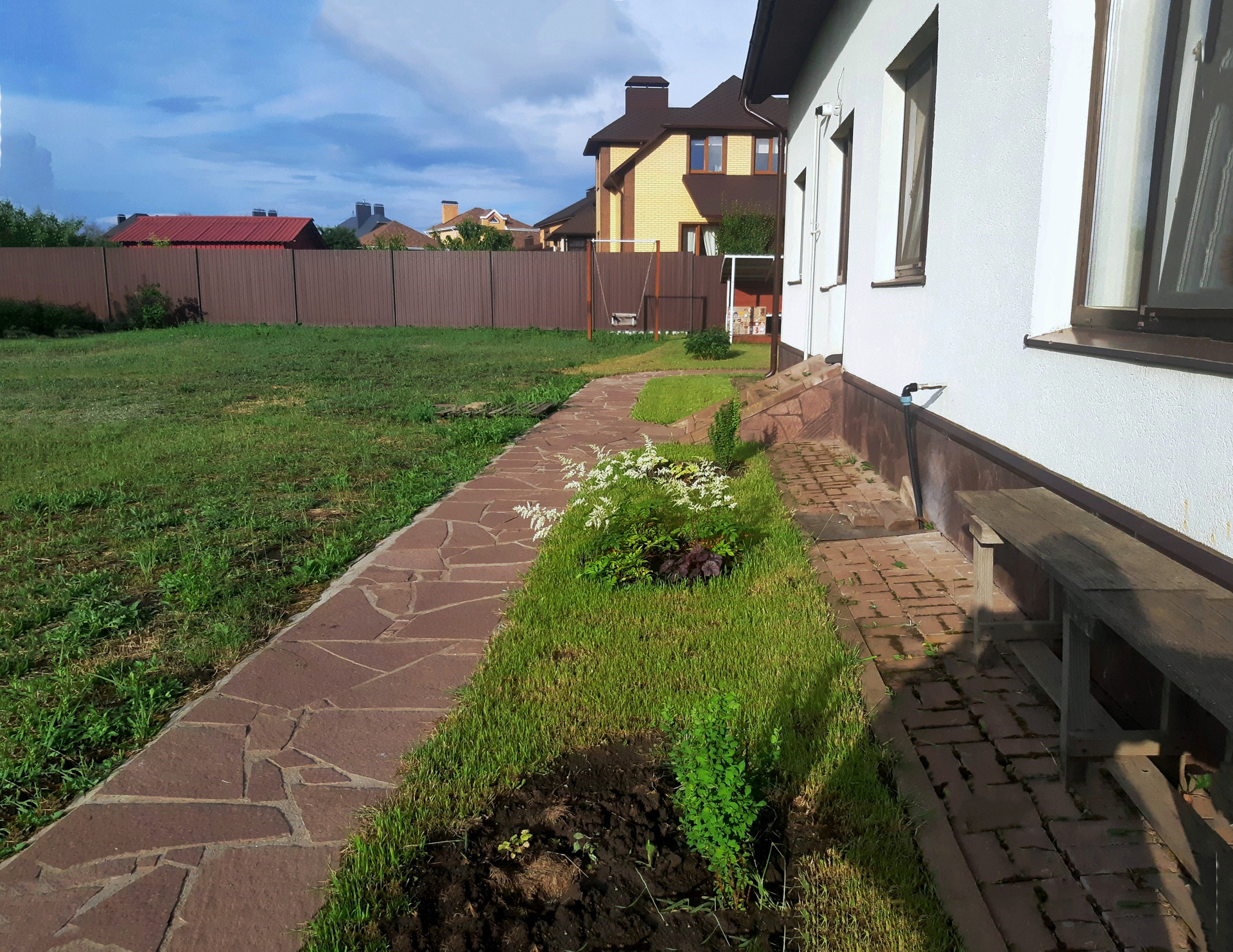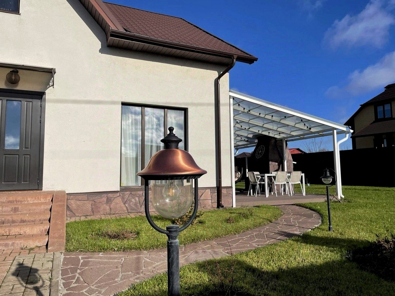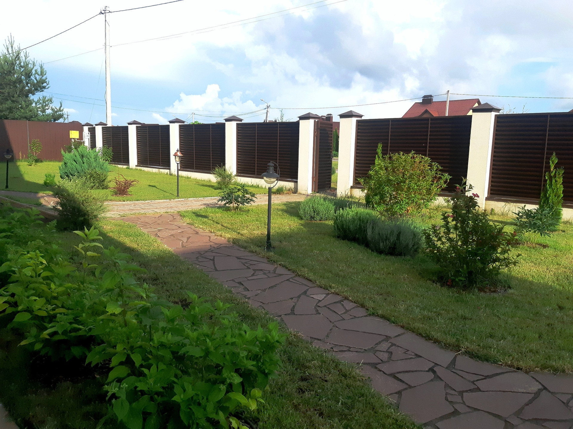 - Благоустроенный двор с декоративным озеленением и освещением. Во дворе навес для машины (24 кв. м.) и пристройка для хозяйственных нужд (16 кв. м).