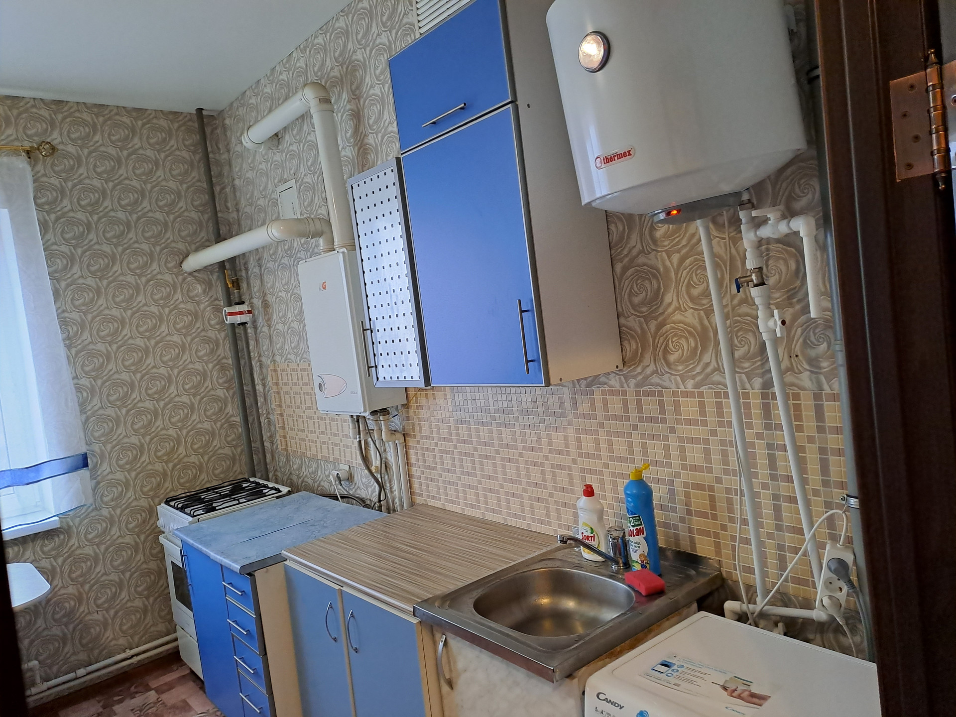 с/у 3,5 кв.м. Лоджия застекленная 6 кв.м. .\ Хороший, свежий ремонт во всех комнатах: натяжные потолки, линолеум Стоят счетчики на воду/газ/свет. В шаговой доступности школа, садик, магазин, остановка. Имеется возможность перепланировки. Реальному покупателю реальный торг.