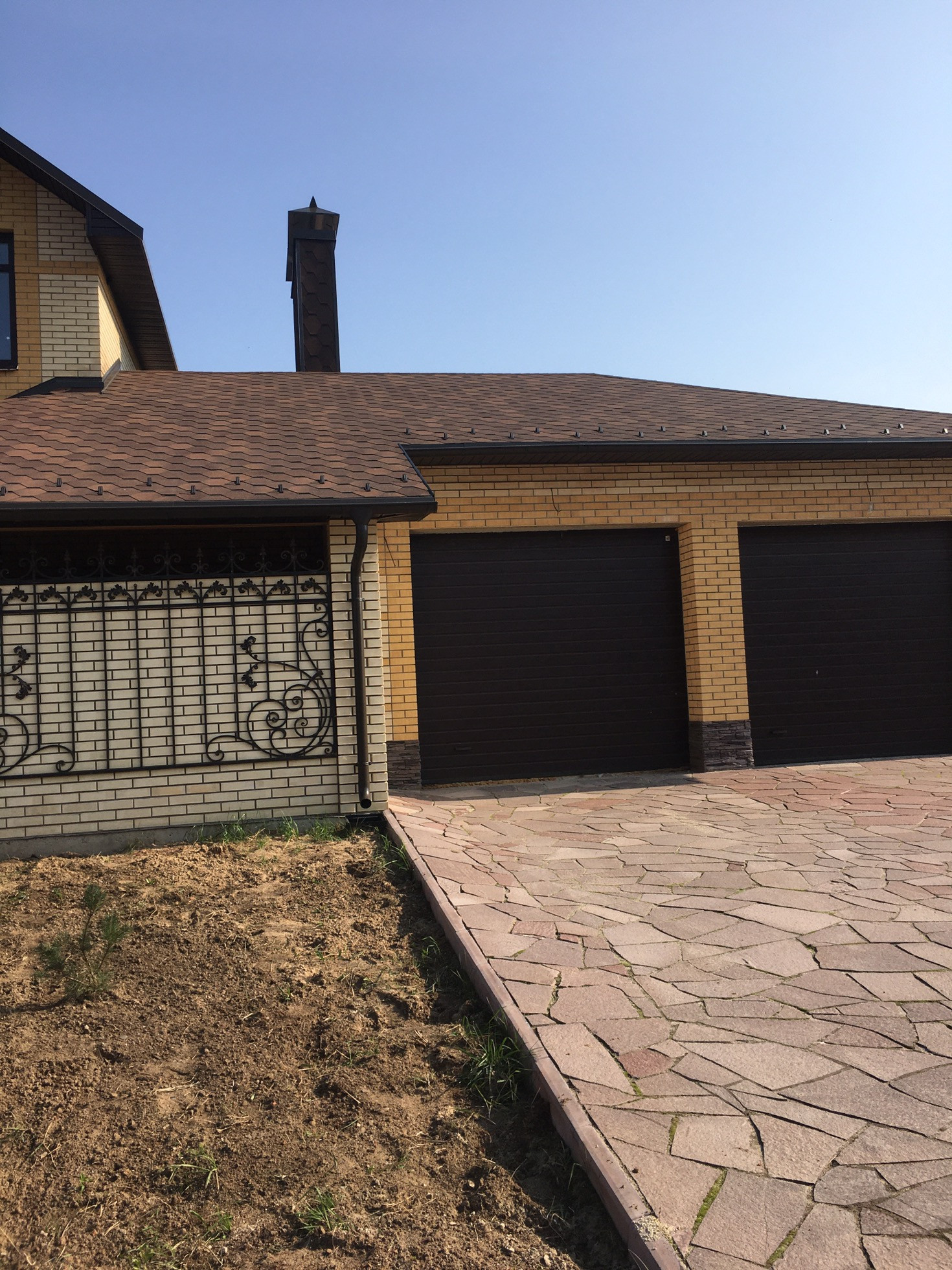 Гараж на 2 м/м с автоматическими воротами,баня  6*10 - оцилиндрованное бревно.  По периметру- ограждение из камня(сланец). Ковка.
