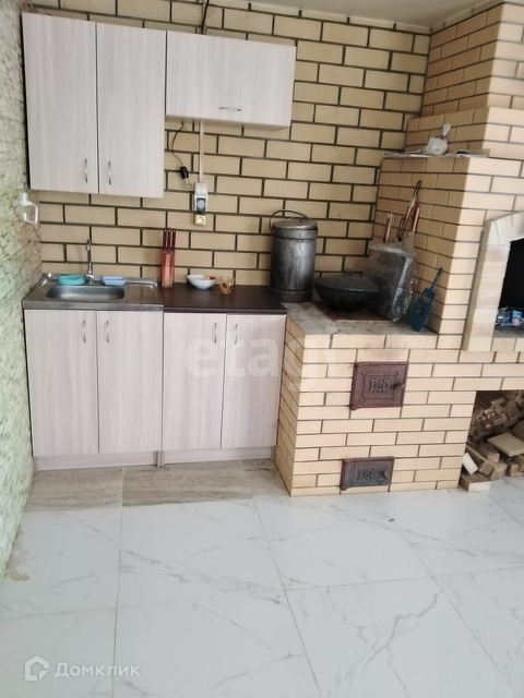 - Летняя кухня со сделанной на заказ печь-камином и зоной отдыха