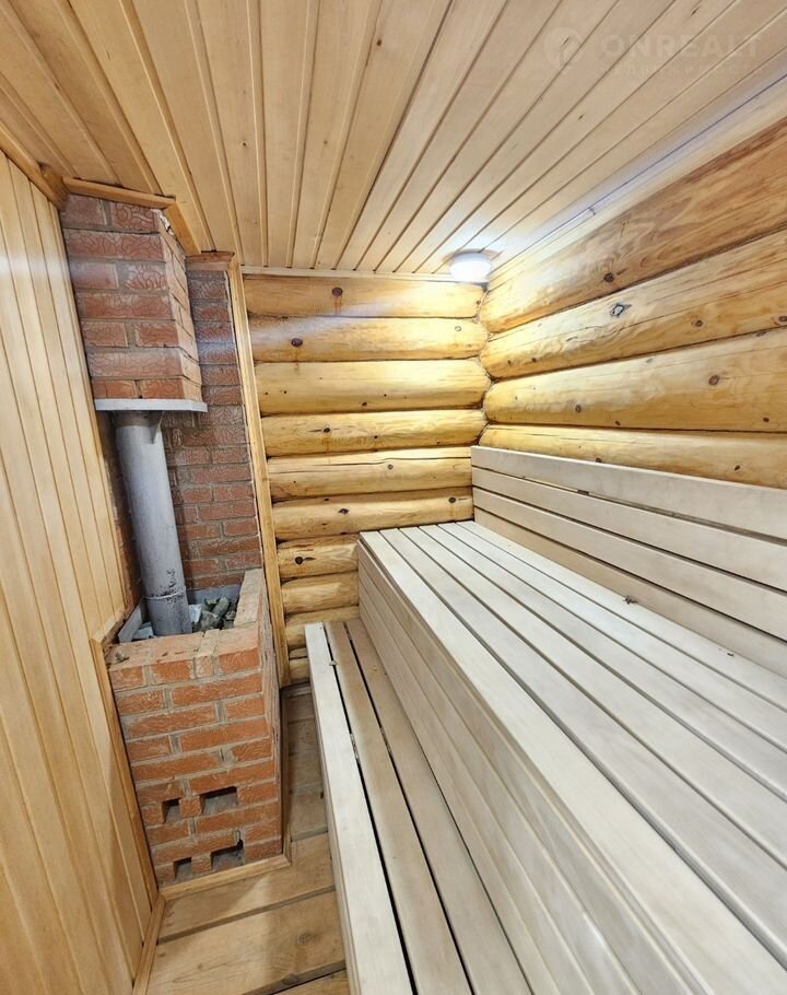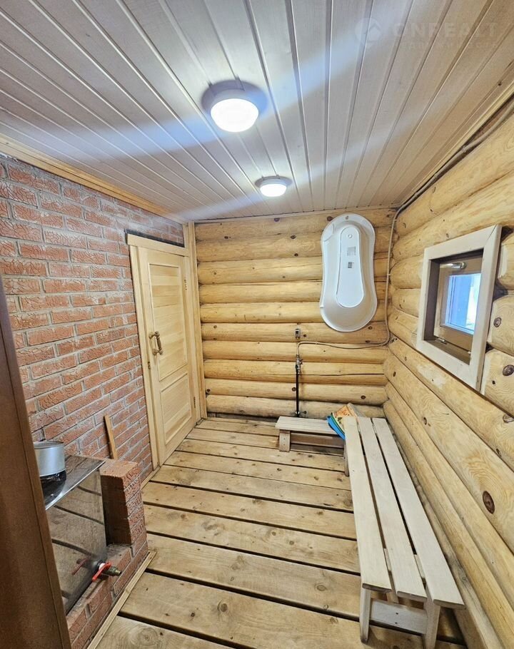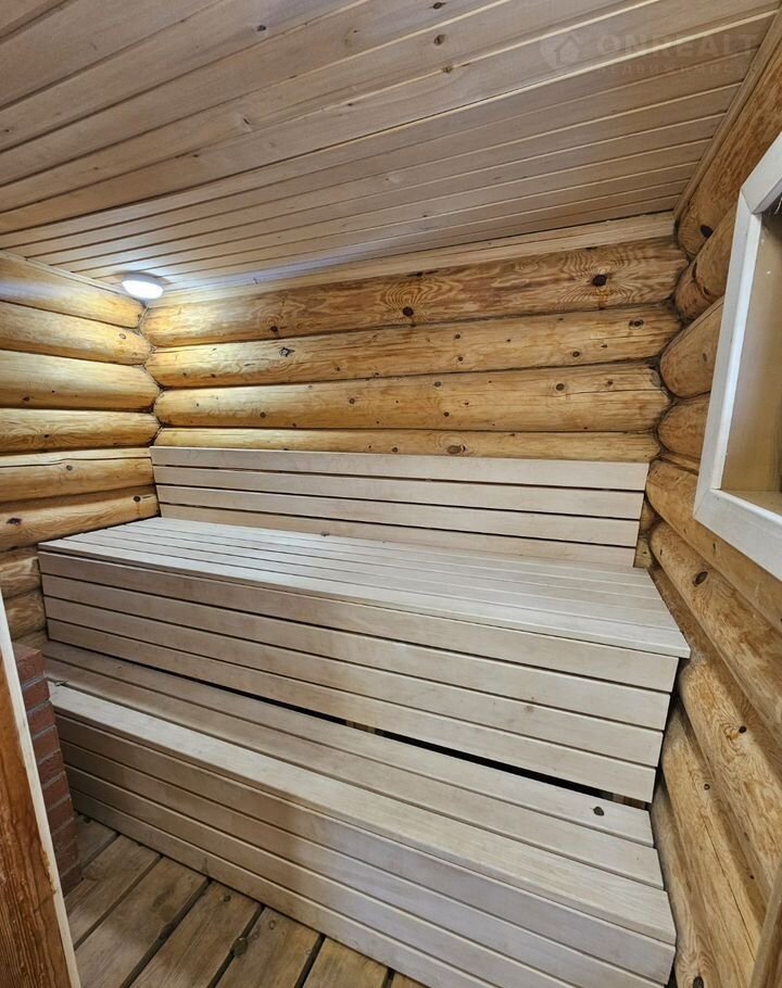 - Современная баня с комнатой отдыха, моечной и парилкой с окном, откуда открывается вид на озеро.