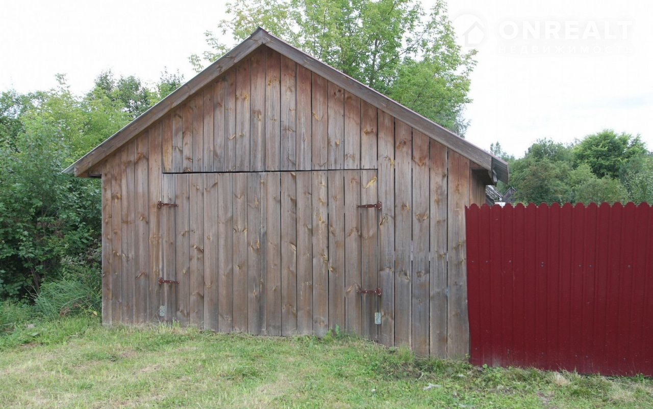 Участок прямоугольной формы, межевание проведено.  Есть плодовые деревья, гараж, сараи.