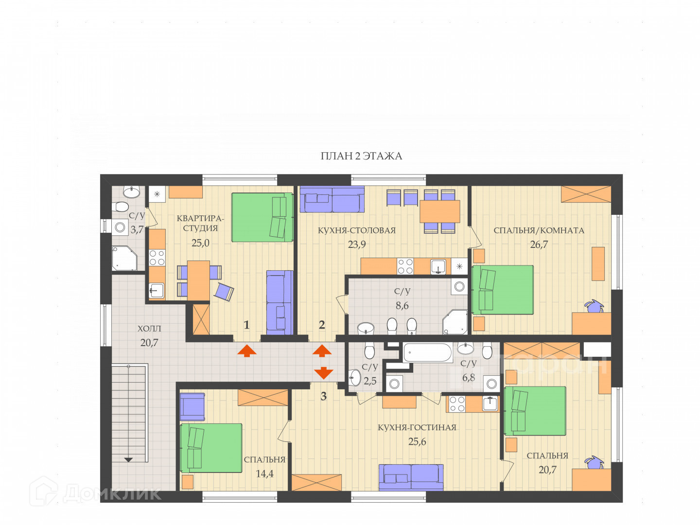 квартира студия + 2 спальни (70м², раздельный санузел)