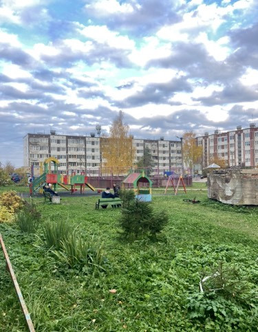 Во дворе детская площадка и хоккейная коробка.
