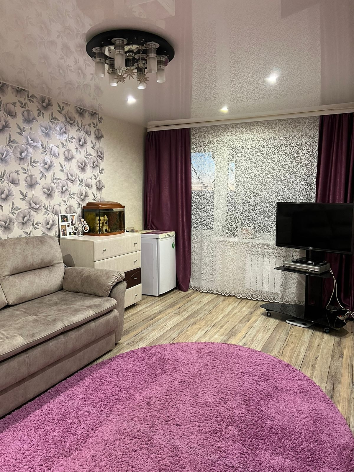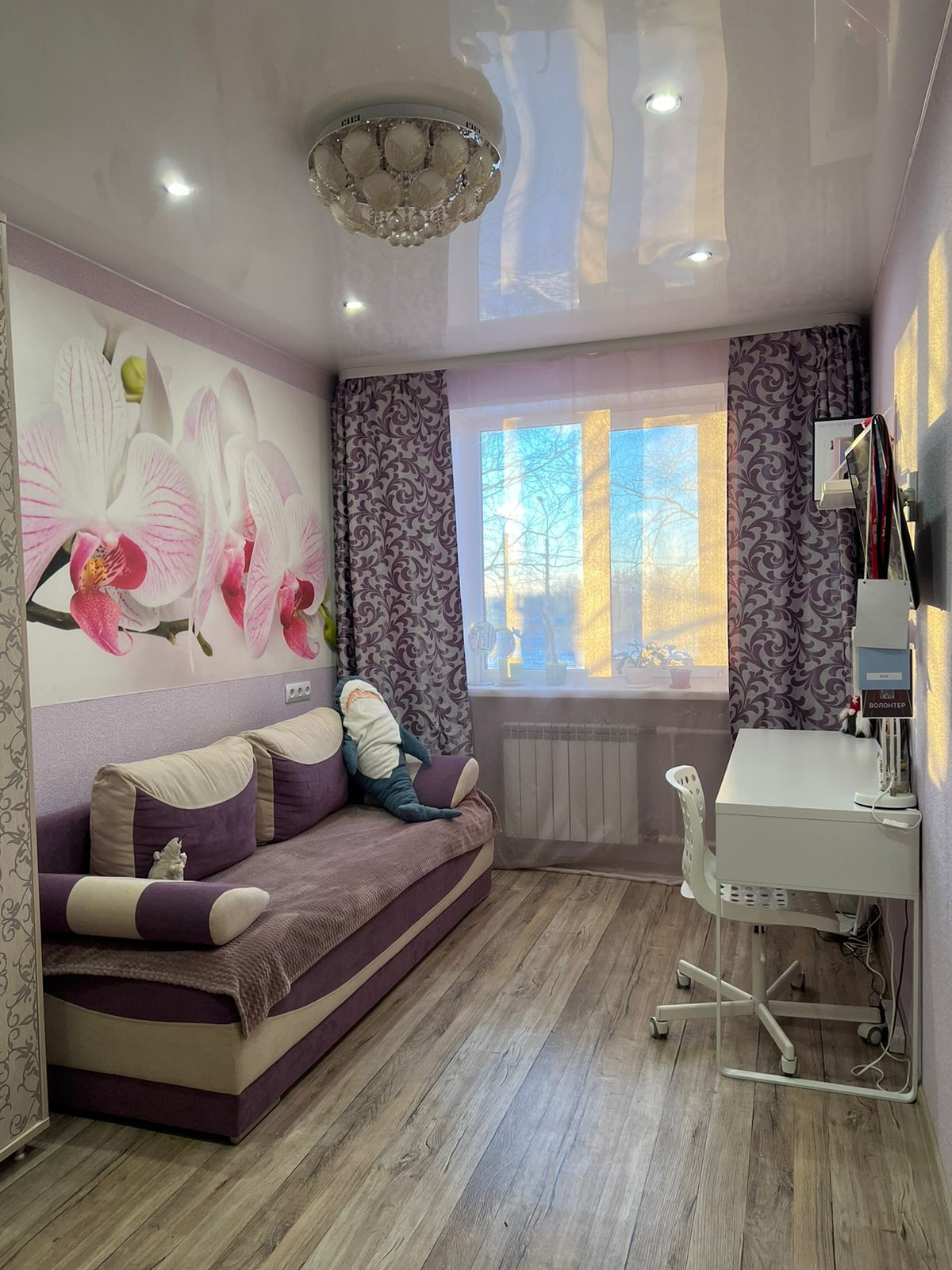 По всей квартире сделан хороший ремонт, натяжные потолки люстры остаются новым жильцам в подарок. Светлая и уютная квартира, которую утром озаряет солнце, а вечером тёплый свет от заката.