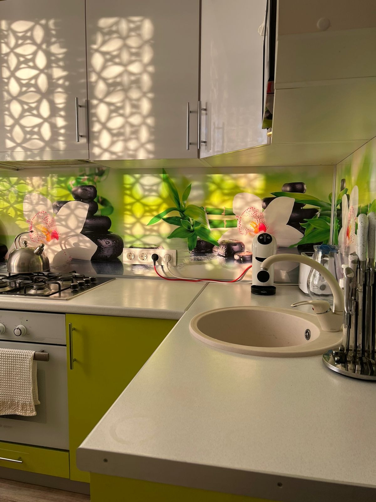 Качественная встроенная кухня, сделанная под заказ, благодаря чему является очень удобной и функциональной. Встроена немецкая фурнитура, которая не позволяет часто открывающимся ящикам создавать шум. Новая входная дверь .