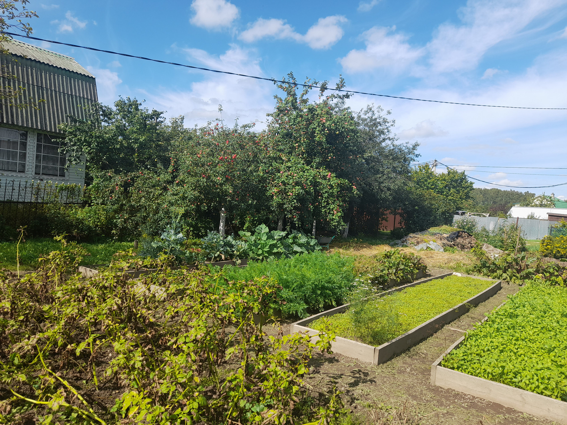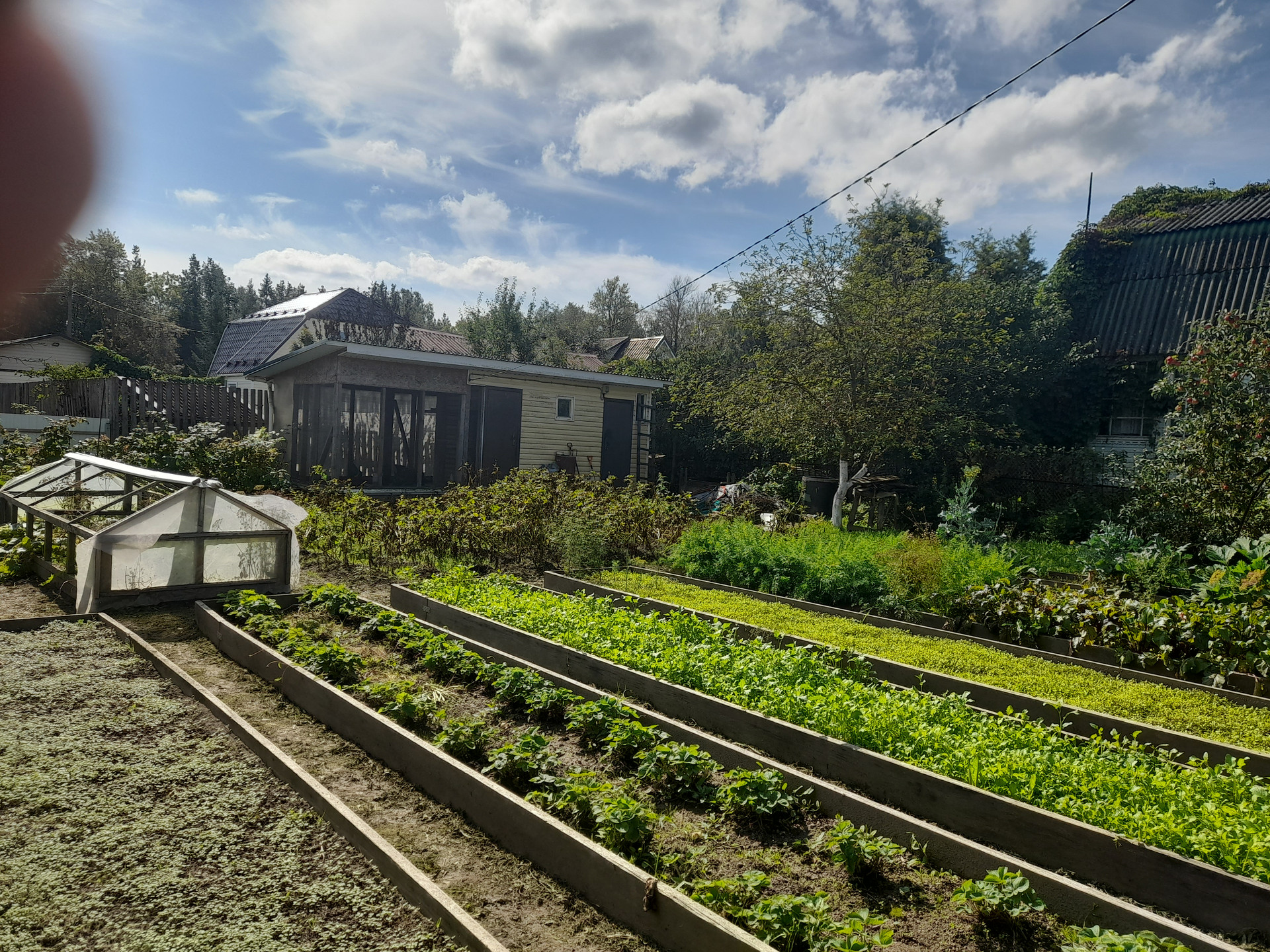 Участок ухожен, 2-вишни, 3-яблони, одна груша привито два сорта груш, все хорошо плодоносит. Есть капитальный хозблок, с ленточным фундаментом и утеплённые полы и стены. Использовался как курятник (с этой целью и строился). Земля плодородная. Мы с женой белорусы, землю любим. Две грядки клубники. Свет подведен, скважина. Строй дом и живи.