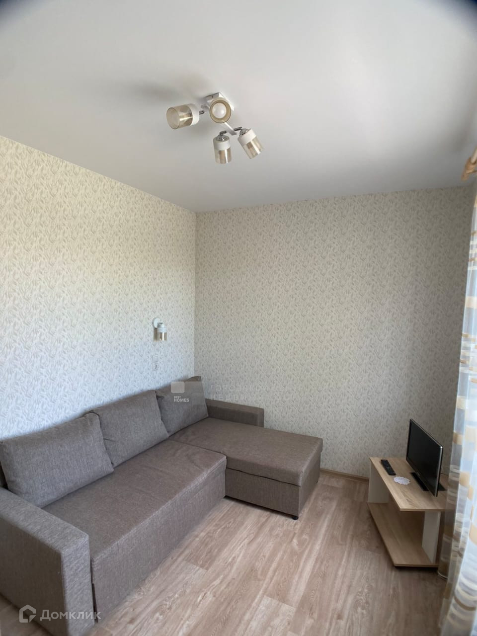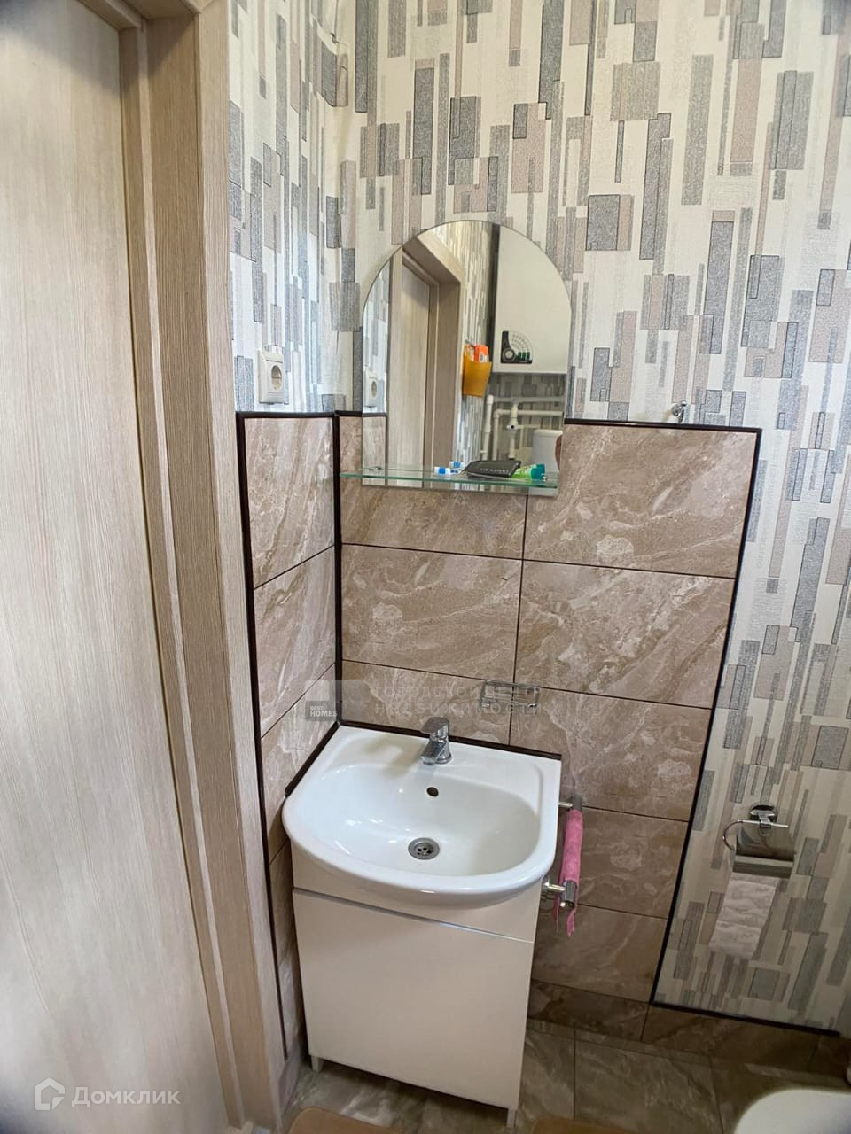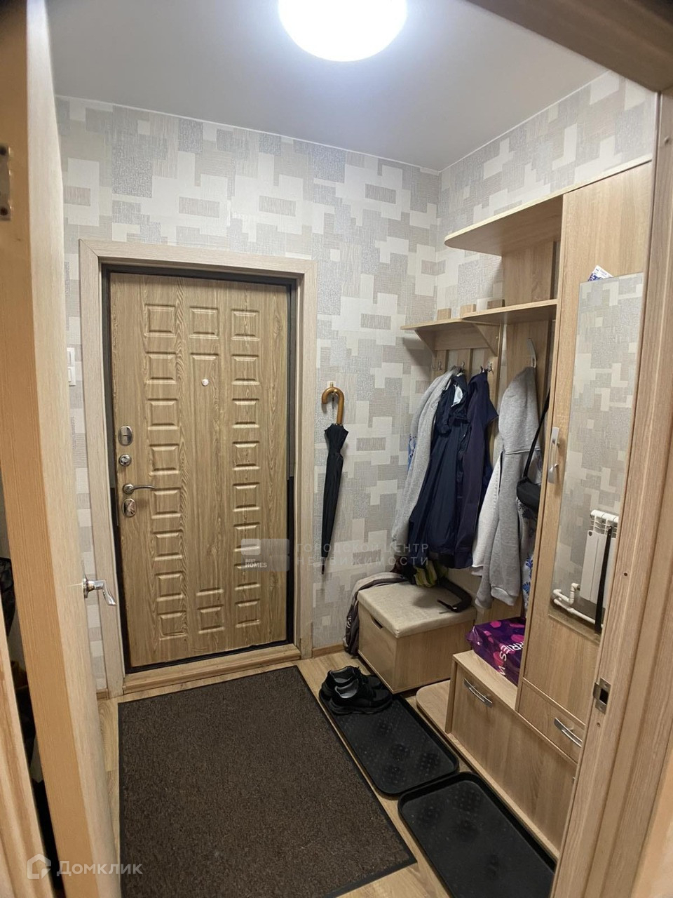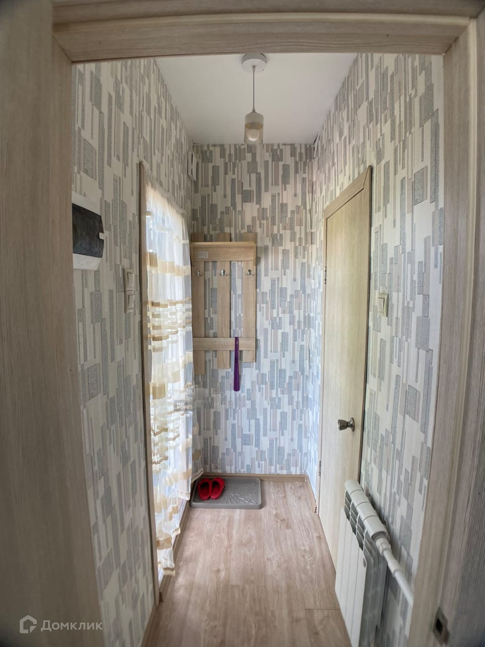 Внутри утеплен, обшит гипсокартоном, красивые современные обои.