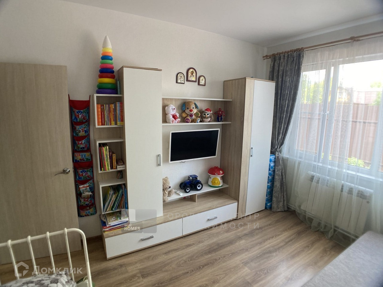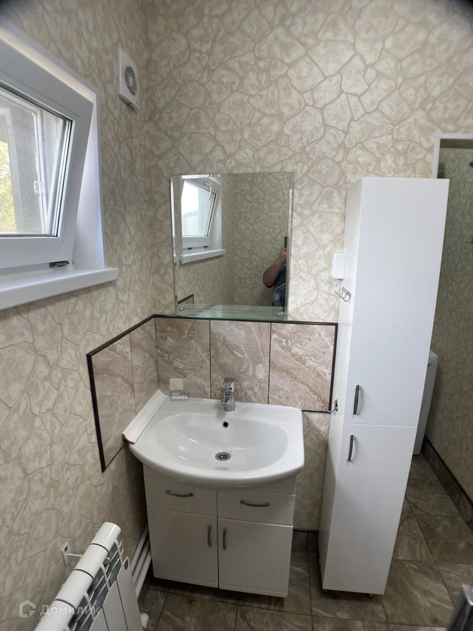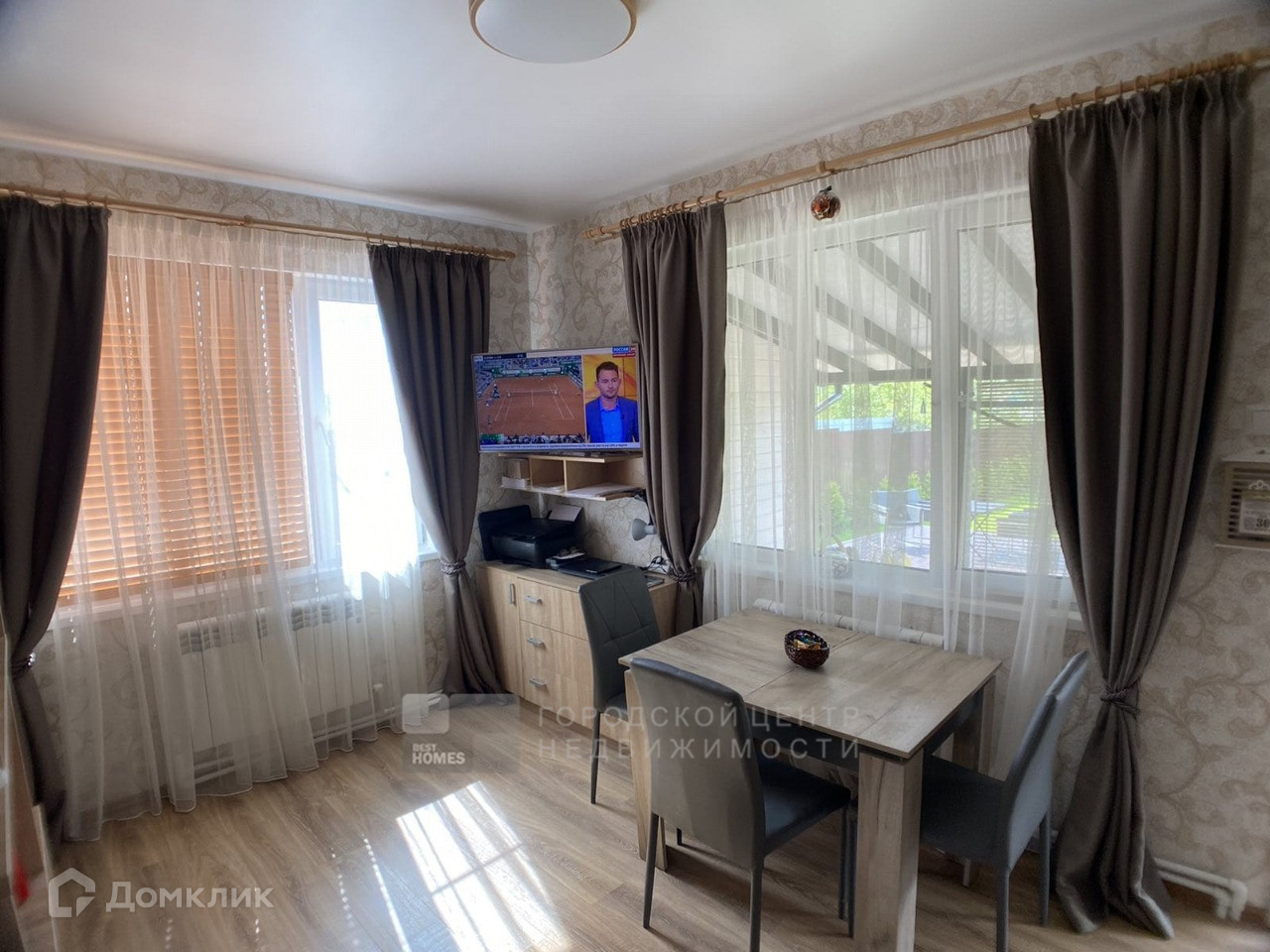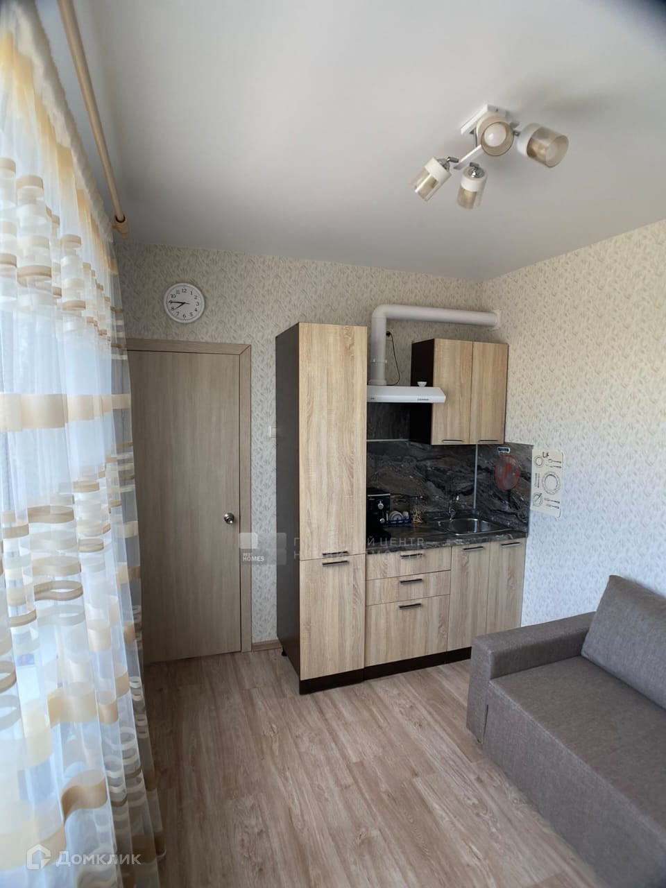 Внутри утеплен, обшит гипсокартоном, красивые современные обои.