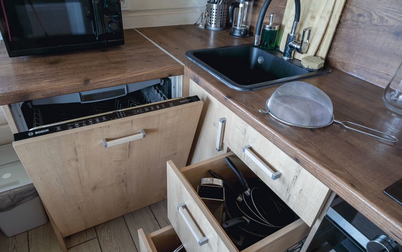 В детском домике есть кухня и стол с стульями и доска-планшет для рисования!