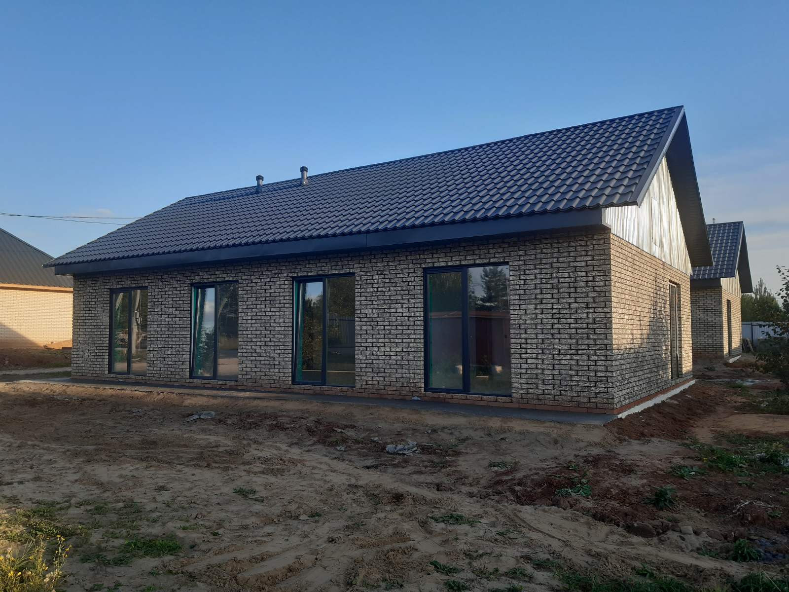 Одноэтажный дом выполнен из газоблока, утеплен минеральной ватой 100 мм и облицован кирпичом на темном растворе.