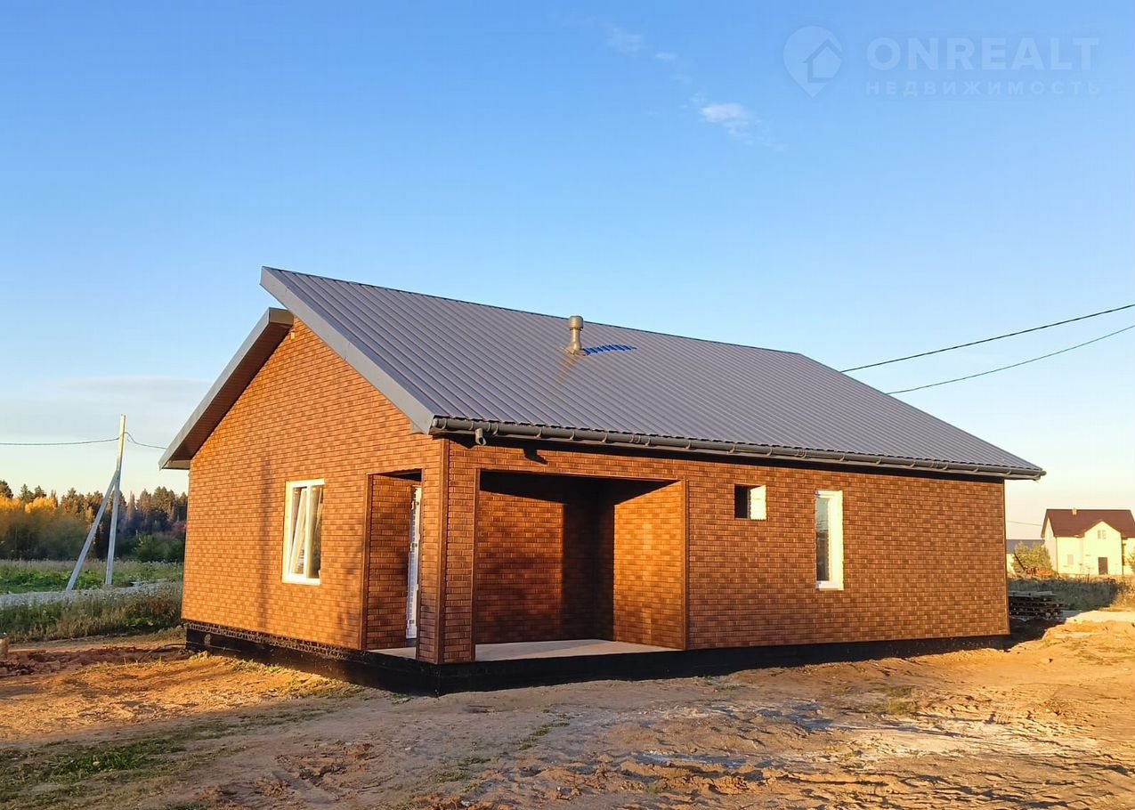 материал стен дома - газобетонный блок с утеплителем, фундамент - ленточный на буронабивных сваях глубиной 2 метра, лента, потолки - натяжные со светильниками, внутренняя отделка - обои под покраску, ламинат, плитка в санузле, межкомнатные двери, сантехника приобретается самостоятельно, наружная отделка - кирпич или утеплитель с облицовочными панелями. Дополнительно мы можем построить автомобильный навес и веранду.